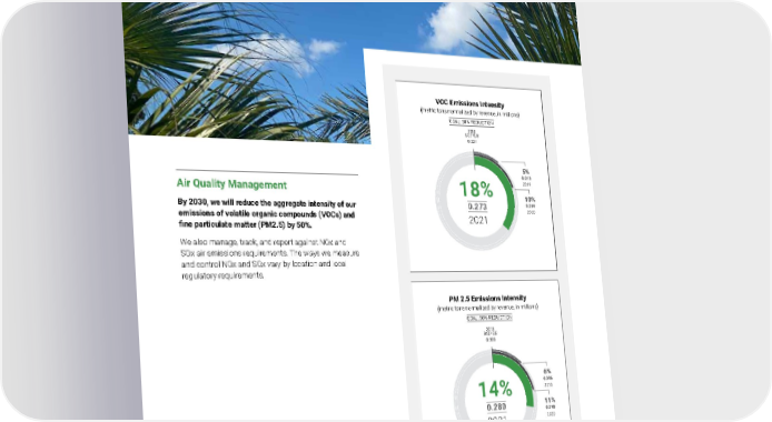 2021 Owens Corning Sustainability Report | Overview | Summary & Highlights | 23 Air Quality Management By 2030, we will reduce the aggregate intensity of our emissions of volatile organic compounds (VOCs) and fine particulate matter (PM2.5) by 50%. We also manage, track, and report against NOx and SOx air emissions requirements. The ways we measure and control NOx and SOx vary by location and local regulatory requirements. Photo submitted by: Julie Childers | Granville, Ohio, U.S. Key West, Florida, U.S. VOC Emissions Intensity (metric tons normalized by revenue, in millions) GOAL: 50% R EDUCTION 18% 0.273 2021 201 8 BASE YEAR 0.331 5% 0.313 2019 10% 0.299 2020 PM 2.5 Emissions Intensity (metric tons normalized by revenue, in millions) GOAL: 50% R EDUCTION 14% 0.280 2021 201 8 BASE YEAR 0.326 6% 0.306 2019 11% 0.290 2020