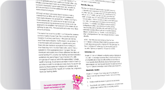 2021 Owens Corning Sustainability Report | Reducing Our Environmental Footprint | Waste Management | 181 Our 2030 waste management goals are quite ambitious, but we are confident they can be achieved through our WTL efforts and the designated resources throughout our businesses. Within this network of committed employees, we regularly share ideas, best practices, and recycling outlets across our plants, businesses, and R&D. Owens Corning has successfully diverted the majority of the waste we generate away from landfills and toward other uses. Offtake customers have found value in these materials and successful transaction agreements have been established, and we continue to find new outlets for specific types of waste streams by region. Although we have had a great deal of success diverting material from landfills, each business unit continues to have waste streams that are landfilled. In their current form, these streams are not usable in another application, and economical recycling processes typically do not exist. Our approach is to establish internal recycling for a more robust pathway to zero WTL. This approach can be seen in all three of our businesses. The waste that is sent to landfill in our Composites business consists mainly of glass fiber. This is also the case for our Insulation business, specifically in the glass and mineral wool fiber waste streams. For this reason, we are investing in technologies and processes to upgrade waste glass fibers into raw materials appropriate for remelting, and then fiberizing them into new fibers to be used within our operations. Once appropriate recycling capabilities are developed and scaled, we will have addressed two-thirds of our remaining WTL volume. Our Roofing business represents a relatively low percentage of our enterprise WTL, with shingle tear-off waste at end-of-life representing the larger landfill challenge. As advances are made in Owens Corning’s activities to build the circular economy model for our shingle products, those same technologies and systems can be leveraged to recycle the majority of the manufacturing waste from our Roofing plants. The following are among the notable waste management initiatives conducted at Owens Corning in 2021. Besana, Italy As part of their commitment to eliminating the use of single- use plastic products, the facility installed 11 water dispensers on the shop floors. Employees were also given personalized, branded water bottles, helping reduce the amount of single- use plastic throughout the plant. Granville, Ohio, U.S. The Granville Material Characterization Lab (MCL) recently underwent a team exercise to identify all lab waste streams, and they have begun to take small but impactful actions to reduce them. The MCL has been actively committed and working toward zero WTL since 2020, and they expanded their aspiration in 2021 to include a shared sustainability goal that holds individuals personally responsible for reducing lab waste. This includes committing to using reusable or biodegradable coffee cups, utensils, and plates, adding more recycling and composting bins, and working with lab customers to reduce the amount of composite materials shipped on-site for testing. The MCL is also dedicated to sharing best practices to facilitate a larger reduction in waste sitewide. In 2021, Granville also received recognition for their commitment to Kimberly-Clark’s RightCycle program, which diverts single-use gloves from the landfill. This past year, the Granville Science & Technology Center recycled over 321 pounds of gloves, compared to 185 pounds in 2020. Liversedge, U.K. As part of their commitment to reducing waste, employees at the plant in Liversedge discovered that cutter housings from one machine are compatible with another and can help cut the composite sheet effectively. Blades that had previously been scrapped can now be used beyond their previous end of life, which places Liversedge closer to their goal of zero WTL. Hässleholm, Sweden As part of their goal of achieving zero WTL, the plant in Hässleholm drew up a four-point action list in which they would: 1. Reduce waste by improving production processes. 2. Recycle all cured waste to blowing wool, using both new ad-mix equipment and the old recycling system. 3. Recycle all spinning waste via briquette. 4. Recycle all cupola dust via briquette. As a result, their WTL has gone from almost 19% in 2013 to just over 4% in 2020, and their goal of zero WTL is well within reach. Our waste management goals benefit our business as well as the environment — by reducing costs associated with transportation, disposal, raw materials, energy, time, and labor. OUR INITIATIVES