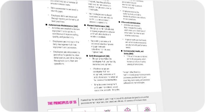 2021 Owens Corning Sustainability Report | Our Approach | Total Productive Maintenance | 79 OUR APPROACH ■ Training and Development (T&D) • Employees are given the knowledge and skills to carry out their responsibilities safely and effectively as a member of an autonomous team. • Skills assessments are used to identify gaps. • Employee skills are improved through training and sharing of best practices. ■ Autonomous Maintenance (AM) • Activities are created to restore equipment to its optimum condition and improve safety, quality, and productivity. • Employees are involved in the daily management of their equipment and processes. • Employees are empowered to prevent or fix problems, slow deterioration, and drive change throughout our culture and operations. ■ Focused Improvement (FI) • TPM teams identify and quantify losses throughout the plant, then they prioritize ways to eliminate losses and assign the right resources to these tasks. • Methodologies are deployed to address issues and ensure continuous improvement across our operations. ■ Planned Maintenance (PM) • This pillar, combined with AM, encourages proactive behavior and facilitates stable and reliable operations. • Supporting systems and processes enable employee engagement and data-driven continuous improvement. ■ Early Management (EM) • This pillar facilitates the development of user-friendly, sustainable equipment. • Effective design and development of new equipment, processes, and products reduce the potential for losses and abnormalities. • Time between development and launch is reduced, as are costs over products’ life cycles. ■ Quality Maintenance (QM) • Optimal equipment conditions are established and maintained, helping prevent losses in quality. • Employees receive the systems, tools, and skills needed to achieve zero defects in our operations. ■ Office and Administration • Activities are stressed that increase the quality, usefulness, and timeliness of information for internal and external customers. • Improvements are facilitated, and administrative resources are aligned with performance needs. ■ Environmental, Health, and Safety (EHS) • TPM activities are combined with EHS programs, which fosters a culture of safety among all employees. For each pillar, there is a multifunctional group that implements processes, provides training and coaching, leads cases, and assesses adherence to methodologies. Planned Maintenance builds upon the principles of 5S, which are designed to ensure that processes remain organized, disciplined, and efficient. 5S consists of five basic steps: Sort Remove all unnecessary items from the work area. Set in Order Organize the remaining items. Shine Clean and inspect the work area. Standardize Create standards that will ensure consistency going forward. Sustain Maintain a culture of continuous improvement. THE PRINCIPLES OF 5S Total Productive Maintenance is based on eight pillars.