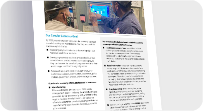 2021 Owens Corning Sustainability Report | Overview | Summary & Highlights | 17 Our Circular Economy Goal By 2030, we will establish viable circular economy business models involving our materials and how they are used. We can accomplish this by: ■ Increasing recycled content and decreasing virgin raw materials used in our products. ■ Developing technical solutions and practical business models for our product materials and packaging, so they can be used for beneficial purposes even after they are no longer used for the original purpose. ■ Collaborating up and down the supply chain, with customers, suppliers, communities, academics, policy makers, government entities, and other organizations. Our circular economy efforts are focused in two areas: ■ Manufacturing This work focuses on meeting our 2030 waste management goals — reducing the intensity of waste generated by our processes by 50%, and then finding ways to reuse or recycle the rest — as well as our efforts to expand the use of recycled materials in our manufacturing operations and our products, across all businesses. ■ End-of-life solutions We are seeking innovative technologies and business models for our products and materials to be reused and repurposed indefinitely. This work includes internal partnerships among R&D, commercial, and corporate development to shape the vision and execution in this area. We also engage with external partners to develop end-of-life solutions for our products, as well as the products where our materials are used. EXPANDING OUR PRODUCT HANDPRINT Owens Corning works to ensure our products have a positive impact on the world. We believe that by innovating in ways that benefit the planet, we can also help our customers — and strengthen our own business. It’s a principle that requires us to act intentionally, and it informs everything we do as a company. Our most recent initiatives toward establishing circular economy models include the following: ■ The circular economy team , established in 2020, defines goals and prioritizes projects that accelerate our circular economy ambitions. The team also partners with subject matter experts and teams across our company, as well as other stakeholders in the industry. ■ Take-back models encourage manufacturers to accept responsibility for downstream waste from customers using their products. For Owens Corning, this can include waste generated during construction, subsequent fabrication, installation, or protective packaging. Owens Corning Paroc has established take-back models in Sweden and Finland, as well as in our metals packaging products. ■ Shingle recycling efforts are in place, as our Specialty Asphalt paving business is working with state departments of transportation, roofing contractors, and other stakeholders to create a circular economy model for roofing shingles. ■ Owens Corning is a partner in the ZEBRA (Zero WastE Blade ReseArch) project in Europe, a cross-sector consortium launched in 2020 to develop the first 100% recyclable wind turbine blade. Photo submitted by: Houston Plant | Houston, Texas, U.S. Rodney Ivy (left) and Margarito Barreto at the Houston plant.