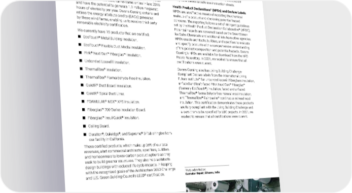 2021 Owens Corning Sustainability Report | Expanding Our Product Handprint | Product Innovation & Stewardship | 107 Made with Renewable Electricity A growing number of Owens Corning ® products, including some of our high-density insulation products and shingles, are certified as made with 100% renewable electricity and are part of a reduced embodied-carbon portfolio. These products were certified in accordance with SCS Global Services’ certification protocol. The certifications are made possible by power purchase agreements Owens Corning signed in 2015, which enabled new wind capacity in Texas and Oklahoma. Both wind farms came online in late 2016 and have the potential to generate 1.1 million megawatt hours of electricity per year. Owens Corning obtains and retires the energy attribute credits (EACs) generated by these wind farms, enabling us to receive third-party renewable electricity certification. We currently have 15 products that are certified: ■ EcoTouch ® Metal Building Insulation. ■ EcoTouch ® Flexible Duct Media Insulation. ■ Pink ® Next Gen™ Fiberglas™ Insulation. ■ Unbonded Loosefill Insulation. ■ Thermafiber ® Insulation. ■ Thermafiber ® Formaldehyde-Free Insulation. ■ QuietR ® Duct Board Insulation. ■ QuietR ® Spiral Duct Liner. ■ FOAMULAR ® NGX™ XPS Insulation. ■ Fiberglas™ 700 Series Insulation Board. ■ Fiberglas™ Insul-Quick ® Insulation. ■ Ceiling Board. ■ Duration ® , Oakridge ® , and Supreme ® 3-Tab shingles from our facility in California. These certified products, which make up 26% of our total revenues, alert commercial architects, specifiers, builders, and homeowners to lower-carbon product options as they seek to build greener structures. They also help architects design buildings with reduced life cycle impacts, in keeping with the recognized goals of the Architecture 2030 Challenge and U.S. Green Building Council’s LEED ® certification. Material Health In accordance with our environmental, health, safety, and product stewardship policy, we provide information about all our products, their performance, and safe use. Product content information can be found on product labels, EPDs, HPDs, and other transparency documents such as Declare labels. Content and disposal information is included on safety data sheets or safe use instruction sheets. Health Product Declarations ® (HPDs) and Declare Labels HPDs are an effective means of reporting the chemical makeup of a product and disclosing potential hazard concerns. The reporting follows a set of stringent guidelines set by the Health Product Declaration Collaborative ® (HPDC). Potential hazards are screened based on the GreenScreen for Safer Chemicals and additional lists from other agencies. HPDs enable architects, builders, and specifiers to evaluate and specify products with a comprehensive understanding of the product composition and potential hazards. Owens Corning’s HPDs are available for download from the HPD Public Repository. In 2021, we worked to ensure that all certifications were current. Owens Corning also has Living Building Challenge- Compliant Declare labels from the International Living Future Institute™ for unbonded loosefill fiberglass insulation, unfaced and kraft-faced PINK Next Gen™ Fiberglas™ (formerly EcoTouch ® ) insulation, faced and unfaced Thermafiber ® formaldehyde-free mineral wool insulation, and Thermafiber ® Rainbarrier ® continuous mineral wool insulation. This certification demonstrates these products are fully compliant with the Living Building Challenge and allows them to be specified for LBC projects. In 2021, we worked to ensure that all certifications were current. Photo submitted by: Karmakar Rupak | Silvassa, India