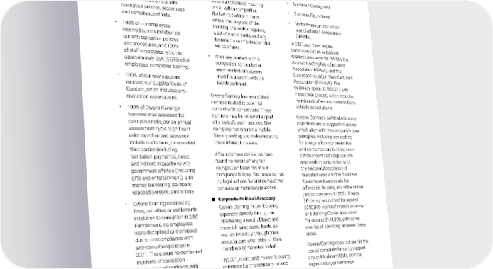 2021 Owens Corning Sustainability Report | Expanding Our Social Handprint | Human Rights & Ethics | 283 review of travel and expenses (T&E) to assess policy compliance, sensitive transactions, and potential misuse or abuse. In 2021, our anti-corruption efforts resulted in the following outcomes: • 100% of the members of our board of directors received communication on our anti- corruption policies, procedures and compliance efforts. • 100% of our employees received communication on our anti-corruption policies and procedures, and 100% of staff employees, which is approximately 28% (5,695) of all employees, completed training. • 100% of our new suppliers received our Supplier Code of Conduct, which includes anti- corruption expectations. • 100% of Owens Corning’s business was assessed for corruption risks, per an annual assessment cycle. Significant risks identified and assessed include customers, independent third parties (including facilitation payments), direct and indirect interactions with government officials (including gifts and entertainment), anti- money laundering, politically exposed persons, and bribery. • Owens Corning received no fines, penalties, or settlements in relation to corruption in 2021. Furthermore, no employees were disciplined or dismissed due to noncompliance with anti-corruption policies in 2021. There were no confirmed incidents of corruption, termination of contracts with business partners, or public legal cases against Owens Corning or its employees related to corruption. ■ Anti-Competitive Behavior In general, Owens Corning discourages employee contact with competitors. Employees who do have contact with a competitor must report that contact to the law department, even if business is not discussed. • Before a scheduled meeting or call with a competitor, the law department must review the purpose of the meeting, the written agenda, a list of participants, and any documents or information that will be shared. • After any contact with a competitor, scheduled or unscheduled, employees must file a report with the law department. Owens Corning has established controls related to potential contact with competitors. These controls may be reviewed as part of a periodic audit process. The company has created a mobile- friendly web app to make reporting these interactions easy. After extensive review, we have found no record of any fair competition breaches in our company’s history. We have also had no legal actions for anti-competitive behavior or monopoly practices. ■ Corporate Political Advocacy Owens Corning incurs lobbying expenses directly through an internal registered lobbyist and three lobbying consultants, as well as indirectly through trade associations who lobby on their members companies’ behalf. In 2021, direct and indirect lobbying expenses for the company totaled $564,390. Lobbying-related expenses are a subset of the company’s overall advocacy- related expenditures, which also includes membership fees for industry associations. In 2021, the company’s overall advocacy-related expense was $3,200,004. In 2021, the five largest lobbying- related expenses totaled to $483,108, and were with the following organizations: • WilmerHale. • Flywheel Government Solutions. • Mehlman Castagnetti. • Business Roundtable. • North American Insulation Manufacturers Association (NAIMA). In 2021, our three largest trade association or lobbyist expenditures were for NAIMA, the Asphalt Roofing Manufacturers Association (ARMA), and the European Insulation Manufacturers Association (EURIMA). The company spent $1,895,373 with these three groups, which includes membership fees and contributions to trade associations. Owens Corning’s political advocacy objectives are to support initiatives which align with the company’s core principles, including advocating for energy efficiency measures and contemporary building code development and adoption. We also work in conjunction with the National Association of Manufacturers and the Business Roundtable to advocate for affordable housing and other social justice concerns. In 2021, Energy Efficiency accounted for around $280,000 worth of related expense, and Building Codes accounted for around $140,000, with some overlap of spending between these areas. Owens Corning does not permit the use of corporate funds to support any political candidate, political organization, or campaign.
