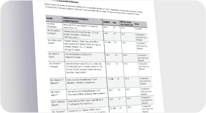 2021 Owens Corning Sustainability Report | Our Approach | Board Leadership | 51 BOARD LEADERSHIP In the sustainability world, we often discuss ESG impacts, which refer to three key elements of our approach — environmental, social, and governance. For the governance portion of this approach, we rely on our board of directors to provide essential leadership. The individuals who serve on our board share our commitment to reducing our negative impacts, increasing our positive impacts, and maintaining ethical standards, while also ensuring the growth of the company. NAME SIGNIFICANT POSITIONS & COMMITMENTS GENDER AGE INITIAL YEAR AS A DIRECTOR ROLE Mr. Brian Chambers President, CEO, and Chair of the Board for Owens Corning Male 55 2019 Executive Mr. Eduardo E. Cordeiro* Former Executive Vice President, CFO of Cabot Corporation, Director at FMC Corporation Male 54 2019 Independent Non-Executive Director Ms. Adrienne D. Elsner* Former President, Chief Executive Officer and Director of Charlotte’s Web Holding, Inc. Former President of U.S. Snacks, Kellogg Company Female 59 2018 Independent Non-Executive Director Mr. Alfred E. Festa Former Chairman and CEO, W.R. Grace & Company Male 62 2020 Independent Non-Executive Director Mr. Edward F. Lonergan Executive Chairman of Zep, Inc., Chairman of DRB Systems Inc, Former Director of The Schwan Food Company, Senior Advisor at New Mountain Capital Male 62 2013 Independent Non-Executive Director Ms. Maryann T. Mannen* Executive Vice President and CFO of Marathon Petroleum Corporation Female 59 2014 Independent Non-Executive Director Mr. Paul E. Martin* Former Senior Vice President and Chief Information Officer for Baxter International Inc. Male 63 2021 Independent Non-Executive Director Mr. W. Howard Morris* President and Chief Investment Officer of The Prairie & Tireman Group Male 61 2007 Independent Non-Executive Director Ms. Suzanne P. Nimocks* Former Senior Partner of McKinsey & Company, Director of Ovintiv Inc, Valaris plc, and ArcelorMittal Female 63 2012 Independent Non-Executive Director Mr. John D. Williams President, CEO and Director of Domtar Corporation, Director of Form Technologies Male 67 2 011 Independent Non-Executive Director The Owens Corning Board of Directors Owens Corning’s board of directors consists of one executive director and nine independent non-executive directors. Of these 10 individuals, three are people of color and three are female. Those board members are noted with an asterisk (*) below.