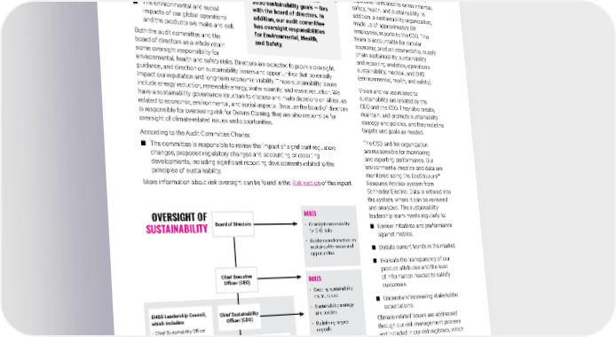 2021 Owens Corning Sustainability Report | Our Approach | Board Leadership | 53 Management Oversight of Sustainability According to our Directors’ Code of Conduct, sustainability includes the following concepts: ■ Environmental compliance. ■ Product stewardship. ■ Personal safety. ■ The environmental and social impacts of our global operations and the products we make and sell. Both the audit committee and the board of directors as a whole retain some oversight responsibility for environmental, health and safety risks. Directors are expected to provide oversight, guidance, and direction on sustainability issues and opportunities that potentially impact our reputation and long-term economic viability. These sustainability issues include energy reduction, renewable energy, water scarcity, and waste reduction. We have a sustainability governance structure to discuss and make decisions on all issues related to economic, environmental, and social aspects. Because the board of directors is responsible for overseeing risk for Owens Corning, they are also responsible for oversight of climate-related issues and opportunities. According to the Audit Committee Charter: ■ The committee is responsible to review the impact of significant regulatory changes, proposed regulatory changes and accounting or reporting developments, including significant reporting developments related to the principles of sustainability. More information about risk oversight can be found in the Risk section of this report. Owens Corning created the chief sustainability officer (CSO) role in 2007 to underscore the essential role sustainability plays in our overall operations. The CSO reports directly to the CEO and is responsible for our compliance with legal and company requirements related to environmental, safety, health, and sustainability. In addition, a sustainability organization, made up of approximately 50 employees, reports to the CSO. This team is accountable for circular economy, product stewardship, supply chain sustainability, sustainability and reporting analytics, operations sustainability, medical, and EHS (environmental, health, and safety). Vision and values related to sustainability are created by the CEO and the CSO. They also create, maintain, and promote sustainability strategy and policies, and they redefine targets and goals as needed. The CSO and his organization are responsible for monitoring and reporting performance. Our environmental metrics and data are monitored using the EcoStruxure™ Resource Advisor system from Schneider Electric. Data is entered into the system, where it can be reviewed and analyzed. The sustainability leadership team meets regularly to: ■ Review initiatives and performance against metrics. ■ Debate current trends in the market. ■ Evaluate the transparency of our product attributes and the level of information needed to satisfy customers. ■ Understand increasing stakeholder expectations. Climate-related issues are addressed through our risk management process and included in our risk registers, which are developed by the business and legal teams from the plant level up. Oversight of sustainability — including all elements of our 2030 sustainability goals — lies with the board of directors. In addition, our audit committee has oversight responsibilities for Environmental, Health, and Safety. OVERSIGHT OF SUSTAINABILITY SUSTAINABILITY ORGANIZATION Chief Sustainability Officer (CSO) Sustainability Champions EH&S Leadership Council, which includes: • Chief Sustainability Officer (executive sponsor) • Enterprise Environmental • Enterprise Safety • Enterprise Medical, Health • Insulation, Director – EHS • Roofing, Director – EHS • Composites, Director – EHS • Regulatory Law Sustainability Leadership Team Chief Executive Officer (CEO) Board of Directors ROLES • Creating sustainability vision, values • Sustainability strategy and policies • Redefining targets or goals • Performance monitoring and reporting ROLES • Reports on delivery of goals and targets ROLES • Oversight responsibility for EHS risks • Guidance and direction on sustainability issues and opportunities