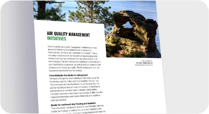 2021 Owens Corning Sustainability Report | Reducing Our Environmental Footprint | Air Quality Management | 162 AIR QUALITY MANAGEMENT INITIATIVES One of our key air quality management initiatives centers around eliminating formaldehyde from our product formulations. Binder is an important component in many insulation products and nonwoven composites products. Owens Corning has developed formaldehyde-free binder technologies that both reduce formaldehyde emissions from our manufacturing process, as well as reduce formaldehyde emissions in indoor air quality. The following products use formaldehyde-free binder technology. Formaldehyde-free binder in ceiling board We have changed to a formaldehyde-free formulation for the binder used to make technical insulation for ceilings. The chemistry delivers technical insulation products that are formaldehyde-free without compromising mechanical performance in hot and humid climates, where better insulation reduces energy spent on cooling. Additionally, the improved chemistry uses fewer chemicals and creates a stronger product. Binder for cushioned vinyl flooring and insulation Two non-woven composite products use formaldehyde-free binder technology. In addition to using formaldehyde-free ingredients, the binder improves the mechanical performance of the glass composite at elevated temperatures like those typically used in the cushioned vinyl flooring process. By reducing the use of formaldehyde to manufacture our products, we are decreasing our environmental footprint, increasing our product handprint, and creating healthier spaces for people to live and work. Photo submitted by: Jim Close | Toledo, Ohio, U.S. Wisconsin Dells, Wisconsin, U.S.