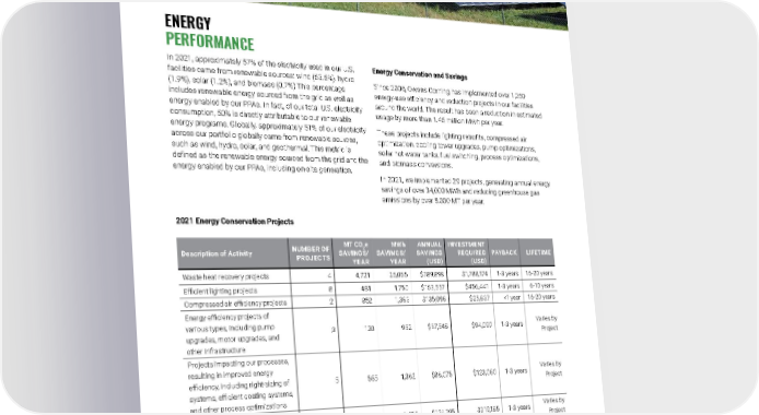 2021 Owens Corning Sustainability Report | Reducing Our Environmental Footprint | Energy Efficiency | 142 2021 Energy Conservation Projects Description of Activity NUMBER OF PROJECTS MT CO 2 e SAVINGS/ YEAR MWh SAVINGS/ YEAR ANNUAL SAVINGS (USD) INVESTMENT REQUIRED (USD) PAYBACK LIFETIME Waste heat recovery projects 4 4,721 26,065 $789,898 $1,78 8 ,174 1-3 years 16-20 years Efficient lighting projects 8 481 1,750 $16 3,55 7 $456,4 41 1-3 years 6 -10 years Compressed air efficiency projects 2 852 1,383 $135,098 $25,837 <1 year 16-20 years Energy efficiency projects of various types, including pump upgrades, motor upgrades, and other infrastructure 3 120 952 $ 5 7, 5 4 8 $94,090 1-3 years Varies by Project Projects impacting our processes, resulting in improved energy efficiency, including right-sizing of systems, efficient coating systems, and other process optimizations 5 585 1,362 $86,075 $123,080 1-3 years Varies by Project HVAC efficiency projects 3 1,12 9 1,558 $124,795 $ 319,18 5 1-3 years Varies by Project Replacing equipment with more energy-efficient technologies 4 439 1,123 $72,377 $136,365 1-3 years 16-20 years TOTA L 29 8,328 3 4,193 $1,429,348 $ 2 ,94 3,173 ENERGY PERFORMANCE In 2021, approximately 57% of the electricity used in our U.S. facilities came from renewable sources: wind (53.5%), hydro (1.9%), solar (1.2%), and biomass (0.7%) This percentage includes renewable energy sourced from the grid as well as energy enabled by our PPAs. In fact, of our total U.S. electricity consumption, 50% is directly attributable to our renewable energy programs. Globally, approximately 51% of our electricity across our portfolio globally came from renewable sources, such as wind, hydro, solar, and geothermal. This metric is defined as the renewable energy sourced from the grid and the energy enabled by our PPAs, including on-site generation. Energy Conservation and Savings Since 2006, Owens Corning has implemented over 1,250 energy-use efficiency and reduction projects in our facilities around the world. The result has been a reduction in estimated usage by more than 1.45 million MWh per year. These projects include lighting retrofits, compressed air optimization, cooling tower upgrades, pump optimizations, solar hot water tanks, fuel switching, process optimizations, and biomass conversions. In 2021, we implemented 29 projects, generating annual energy savings of over 34,000 MWh and reducing greenhouse gas emissions by over 8,000 MT per year. Photo submitted by: Danyelle Lynne Phelps | Granville, Ohio, U.S. Solar field at the plant in Fairburn, Georgia, U.S.