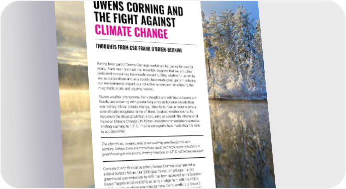 2021 Owens Corning Sustainability Report | Overview | The Fight Against Climate Change | 11 Having been part of Owens Corning’s sustainability journey for over 20 years, I have seen firsthand the incredible progress that we, and other dedicated companies, have made toward building a better future. While we, as corporations and as a society, have made great gains in reducing our environmental impact, our collective actions are not achieving the magnitude, scale, and urgency needed. Severe weather phenomena, from droughts and wildfires to storms and floods, are occurring with greater frequency and greater severity than ever before. Global climate change, linked to human behavior, is now a scientifically recognized driver of these localized weather events. To help stem the devastation that is occurring as a result, the International Panel on Climate Change (IPCC) has issued recommendations aimed at limiting warming to 1.5° C. Their latest reports have made clear the need to act decisively: The planet’s air, oceans, and ice are pushing relentlessly into new territory. Unless there are immediate, rapid, and large-scale reductions in greenhouse gas emissions, limiting warming to 1.5° C will be beyond reach. Consistent with this call to action, Owens Corning is committed to a decarbonized future. Our 2030 goal for reducing Scope 1 and 2 greenhouse gas emissions by 50% has been approved by the Science- Based Targets initiative (SBTi) as being in alignment with the IPCC’s 1.5° C maximum global warming pathway. Concurrently, our Scope 3 greenhouse gas reduction goal of 30% has been approved by the SBTi as being in alignment with the IPCC’s well below 2.0° C pathway. Our definition of total value chain decarbonization is also consistent with the new SBTi guidance. More information about our work on this front can be found in the Combating Climate Change chapter in this report. OWENS CORNING AND THE FIGHT AGAINST CLIMATE CHANGE THOUGHTS FROM CSO FRANK O’BRIEN-BERNINI