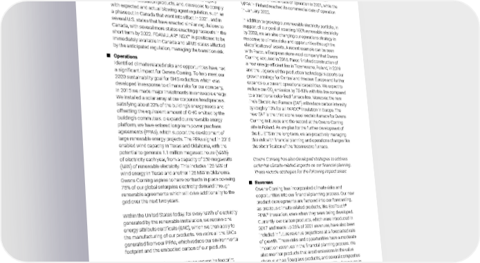 2021 Owens Corning Sustainability Report | Appendices | 355 TCFD CLIMATE RISK & OPPORTUNITIES Appendix G solution lowers the cost of wind energy, thus contributing to the worldwide advancement of this alternative source of energy production. Another significant example of climate-related R&D with near term implications is the development of the newly announced FOAMULAR ® NGX™, a foam insulation optimized to demonstrate a greater than 80% reduction in embodied carbon, compared to legacy FOAMULAR ® insulation products, and, developed to comply with expected and actual blowing agent regulation, such as a phaseout in Canada that went into effect in 2021, and in several U.S. states that have enacted similar regulations to Canada, with several more states enacting phaseouts in the short term by 2022. FOAMULAR ® NGX™ is positioned to be immediately available in Canada and all US states affected by the anticipated regulation, managing the transition risk. ■ Operations Identified climate related risks and opportunities have had a significant impact for Owens Corning. To help meet our 2020 sustainability goal for GHG reduction, which was developed in response to climate risks for our company, in 2015 we made major investments in renewable energy. We installed a solar array at our corporate headquarters, satisfying about 20% of the building’s energy needs and offsetting the equivalent amount of GHG emitted by the building’s commuters. o expand our renewable energy platform, we have entered long-term power purchase agreements (PPAs), which support the development of large renewable energy projects. The PPAs signed in 2015 enabled wind capacity in Texas and Oklahoma, with the potential to generate 1.1 million megawatt hours (MWh) of electricity each year, from a capacity of 250 megawatts (MW) of renewable electricity. This includes 125 MW of wind energy in Texas and another 125 MW in Oklahoma. Owens Corning aspires to have contracts in place covering 75% of our global enterprise electricity demand through renewable agreements which will drive additionality to the grid over the next two years. Within the United States today, for every MWh of electricity generated by the renewable installation, we receive one energy attribute certificate (EAC), which we then apply to the manufacturing of our products. We retire all the EACs generated from our PPAs, which reduce our environmental footprint and the embodied carbon of our products. While it’s possible for a company to reduce its footprint simply by purchasing EACs, Owens Corning believes that we should also be directly responsible for bringing more renewable electricity into the grid through power purchase agreements or virtual power purchase agreements (VPPAs). The (VPPAs) that Owens Corning entered in 2021 will add 91 MW of renewable capacity to the grid. We have entered into two wind VPPAs, one in Finland and one in Sweden, which will bring in 43 MW and 48 MW of renewable electricity capacity, respectively. The VPPA in Sweden reached its commercial date of operation in 2021, while the VPPA in Finland reached its commercial date of operation in January 2022. In addition to growing our renewable electricity portfolio, in support of our goal of sourcing 100% renewable electricity by 2030, we are also changing our operations strategy in response to climate risks and opportunities through the electrification of assets. A recent example can be seen with Paroc, a European stone wool company that Owens Corning acquired in 2018. Paroc finished construction of a new energy-efficient line in Trzemeszno, Poland, in 2019 and the upgrade of the production technology supports our growth strategy for Central and Western Europe and further expands our current operational capabilities. We expect to reduce our CO 2 emission by 75-80% with this line compared to a traditional coke-fired furnace line. Moreover, the new line’s Electric Arc Furnace (EAF) will reduce carbon intensity by roughly 10% for all PAROC ® Insulation in Europe. The new EAF is the third stone wool electric furnace for Owens Corning in Europe and the second at the Owens Corning site in Poland. As we plan for the further development of the EU ETS in the long-term, we are proactively managing this risk with financial planning and operations changes like the electrification of the Trzemeszno furnace. Owens Corning has also developed strategies to address potential climate-related impacts on our financial planning. These include strategies for the following impact areas: ■ Revenues Owens Corning has incorporated climate risks and opportunities into our financial planning process. Our new product developments are factored into our forecasting, as previous climate related products, like EcoTouch ® PINK ® Insulation, were when they were being developed. Currently low carbon products, which were introduced in 2017 and made up 26% of 2021 revenues, have also been included in future revenue projections at a forecasted rate of growth. These risks and opportunities have a moderate impact on revenues in the financial planning process. We also monitor products that avoid emissions in the value chain, such as fiberglass products, and several composites products. These products accounted for 63% of revenues in 2021. Potential impacts of climate risks and opportunities on revenues include identified long-term opportunities, such as the growth in non-flammable insulation products in the long term due to stricter code adoption in North America.