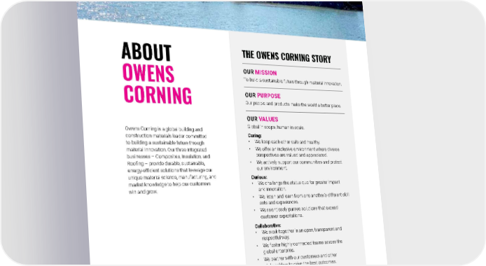 2021 Owens Corning Sustainability Report | Overview | About Owens Corning | 6 ABOUT OWENS CORNING Owens Corning is a global building and construction materials leader committed to building a sustainable future through material innovation. Our three integrated businesses – Composites, Insulation, and Roofing – provide durable, sustainable, energy-efficient solutions that leverage our unique material science, manufacturing, and market knowledge to help our customers win and grow. Photo submitted by: Julie Pope | Toledo, Ohio, U.S. Owens Corning world headquarters. OUR MISSION To build a sustainable future through material innovation. OUR PURPOSE Our people and products make the world a better place. OUR VALUES Global in scope, human in scale. Caring: • We keep each other safe and healthy. • We offer an inclusive environment where diverse perspectives are valued and appreciated. • We actively support our communities and protect our environment. Curious: • We challenge the status quo for greater impact and innovation. • We listen and learn from one another’s different skill sets and experiences. • We relentlessly pursue solutions that exceed customer expectations. Collaborative: • We work together in an open, transparent and respectful way. • We foster highly connected teams across the global enterprise. • We partner with our customers and other stakeholders to drive the best outcomes. Committed: • We are accountable to deliver financial and operational results that outperform the market. • We empower our people to make decisions and act like owners. • We remain resilient to achieve our goals and best serve our purpose. THE OWENS CORNING STORY