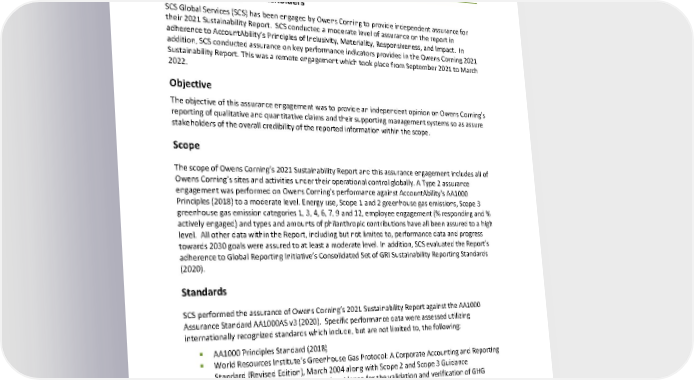 © SCS Global Services Page 1 of 5 Independent Assurance Statement To Owens Corning’s Stakeholders SCS Global Services (SCS) has been engaged by Owens Corning to provide independent assurance for their 2021 Sustainability Report. SCS conducted a moderate level of assurance on the report in adherence to AccountAbility’s Principles of Inclusivity, Materi ality, Responsiveness, and Impact. In addition, SCS conducted assurance on key performance indicators provided in the Owens Corning 2021 Sustainability Report. This was a remote engagement which took place from September 2021 to March 2022. Objective The objective of this assurance engagement was to provide an independent opinion on Owen s Corning’s reporting of qualitative and quantitative claims and their supporting management systems so as assure stakeholders of the overall credibility of the reported i nformation within the scope . Scope The scope of Owens Corning’s 202 1 Sustainability Report and this assurance engagement includes all of Owens Corning’s sites and activities under their operational control globally. A Type 2 assurance engagement was performed on Owens Corning’s performance against AccountAbility’s AA1000 Principles (2018) to a moderate level. Energy use, S cope 1 and 2 greenhouse gas emissions , Scope 3 greenhouse gas emission categories 1, 3, 4, 6, 7, 9 and 12, employee engagement (% responding and % actively engaged ) and types and amounts of philanthropic c ontributions have all been assured to a high level . All other data within the R eport, including but not limited to, performance data and progress towards 2030 goals were assured to a t least a moderate level. In addition, SCS evaluated the Report ’s adherence to Global Reporting Initiative’s Consolidated Set of GRI Sustainab ility Reporting Standards (202 0). Standards SCS pe rformed the assurance of Owens Corning ’s 2021 Sustainability Report against the AA1000 Assurance Standard AA1000AS v3 (2020) . Specific performance data were assessed utilizing internationally recognized standards which include, but are not limited to , the following : § § AA1000 Principles Standard (2018) § § World Resources Institute’s Greenhouse Gas Protocol: A Corporate Acco unting and Reporting Standard (R evised Edition), March 20 04 along with Scope 2 and Scope 3 Guidance § § ISO 14064- 3:2006 Specification with guidance for the validation and verification of GHG assertions . § § Consolidated Set of GRI Sustainability Reporting Standards 2020 § § Dow Jones Corporate Sustainability Assessment (CSA) 2021 2021 Owens Corning Sustainability Report | Appendices | 345 ASSURANCE STATEMENT Appendix F
