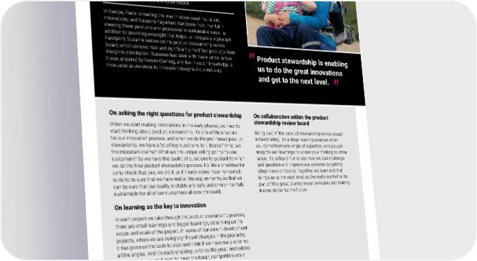2021 Owens Corning Sustainability Report | Expanding Our Product Handprint | Product Innovation & Stewardship | 109 SPEAKING OF SUSTAINABILITY In Europe, Paroc is leading the way in stone wool insulation innovations, and Susanne Fagerlund has been instrumental in steering these products and processes in sustainable ways. In addition to providing oversight that helps us increase our product handprint, Susanne serves on the product stewardship review board, which reviews new and significantly modified products from design to distribution. Susanne has been with Paroc since before it was acquired by Owens Corning, and her in-depth knowledge is invaluable as we strive to innovate throughout our industry. Photo courtesy of Susanne Fagerlund On asking the right questions for product stewardship When we start making innovations, in the early phases, we need to start thinking about product stewardship. It’s one of the enablers for our innovation process, and when we do the preliminary product stewardship, we have a lot of key questions. Is it doable? What are the important claims? What are the unique selling points for our customers? So we have this toolkit of questions to go back to when we do the final product stewardship process. It’s like a checkbox for us to check that, yes, we did it, or if there’s some more homework to do to be sure that we have met all the requirements, so that we can be sure that our quality is stable and safe and environmentally sustainable for all of our customers all over the world. On learning as the key to innovation In each project we take through the product stewardship process, there are small learnings and bigger learnings, depending on the scope and scale of the project. In some of our recent development projects, where we are doing significant changes in the products, it has given us the tools to stop and think if we have really widened all the angles. And it’s really enabling us to do the great innovations and get us to the next level to meet the tough, competitive world and the customer expectations. I’m really happy for our recent launches such as PAROC ® Natura Lana, which is our first carbon neutral product, and which went through these processes where we were thinking about how the product is developed and handled. On collaboration within the product stewardship review board Being part of the product stewardship review board is fascinating. It’s a deep learning exercise when you come from one angle of expertise, and you get insights and learnings to widen your thinking to other areas. It’s actually fun to see how we can challenge and question and improve our systems by getting other views on topics. Together we learn and that brings us to the next level, so I’m really excited to be part of this great journey in our company and making it even better for the future. Product stewardship is enabling us to do the great innovations and get to the next level. ” “ Susanne Fagerlund Senior R&D Leader, Mineral Wool