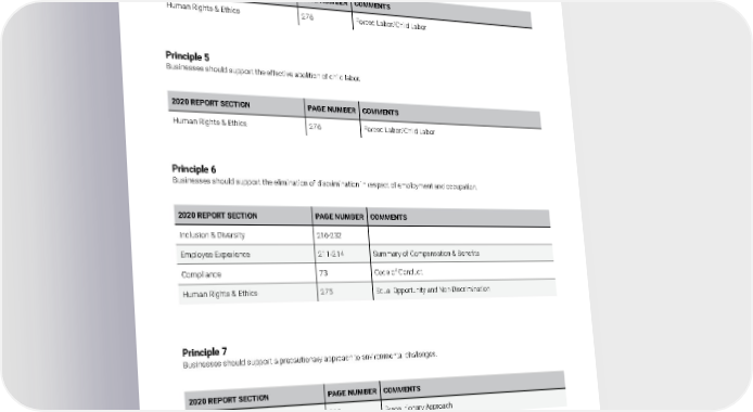 Principle 7 Businesses should support a precautionary approach to environmental challenges. 2020 REPORT SECTION PAGE NUMBER COMMENTS About the Report 290 Precautionary Approach Principle 4 Businesses should support the elimination of all forms of forced and compulsory labor. 2020 REPORT SECTION PAGE NUMBER COMMENTS Human Rights & Ethics 276 Forced Labor/Child Labor Principle 5 Businesses should support the effective abolition of child labor. 2020 REPORT SECTION PAGE NUMBER COMMENTS Human Rights & Ethics 276 Forced Labor/Child Labor Principle 6 Businesses should support the elimination of discrimination in respect of employment and occupation. 2020 REPORT SECTION PAGE NUMBER COMMENTS Inclusion & Diversity 216-232 Employee Experience 211-214 Summary of Compensation & Benefits Compliance 73 Code of Conduct Human Rights & Ethics 275 Equal Opportunity and Non-Discrimination UN GLOBAL COMPACT COMMUNICATION ON PROGRESS INDEX Appendix E 2021 Owens Corning Sustainability Report | Appendices | 341