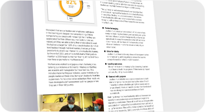 2021 Owens Corning Sustainability Report | Expanding Our Social Handprint | Inclusion & Diversity | 227 Inclusion & Diversity at OC One In January 2021, company leaders from around the world gathered virtually for the 19th annual OC One meeting, in which the executive committee recaps the prior year and shares the company’s priorities for the current year with a select group of leaders. Through a combination of presentations and working sessions, the meeting sets the focus for leader and employee efforts in the year ahead. At this year’s meeting, special attention was given to supporting leaders as they help Owens Corning on our I&D journey. Through internal and external research, we have identified what is most important for leaders to do to lead effectively in our global, flexible, inclusive environment. We believe these leadership skills are not only essential to success today but will continue to be differentiators for our success into the future. ■ Foster belonging Leaders must create an environment of inclusion where everyone feels they truly belong and are being set up for success. When situations change rapidly, or teams are spread out, it is easy for someone to feel left behind or disconnected. All members of the team should feel close and included — whether we are a desk, city, or ocean apart. ■ Drive for clarity Leaders must learn to be very clear and transparent when communicating and delegating to ensure the team is always focused on what is most important. ■ Lead by outcomes We cannot depend on managing by observing. Leaders must learn to track the progress of their teams by impact and results, not by hours worked. ■ Connect with purpose Leaders must intentionally plan conversations to build relationships so that we avoid losing the value of such interactions when schedules get tight or spaces are no longer shared. We must learn to be very intentional about how we strengthen our relationships and build our network. Building strength in these leadership skills will increase our speed and responsiveness across teams and regions to support our customers. These skills will help us mitigate risks associated with a more flexible work environment and set us all up for success. They will build strong habits that benefit all teams, whether on-site, hybrid, or remote. And these skills will support an inclusive work environment where every employee feels a sense of appreciation and belonging. We expect that as our leaders and employees participate in this training and deepen their understanding of these components, our people will increasingly feel that they are appreciated for their differences, their contributions are valued, and they are able to bring their whole selves to work. We had set a target for 100% of our people leaders, from first level leaders through mid-level leaders, directors, and vice presidents to attend our internal inclusive leadership training by the end of 2021, and while we fell short of that goal, we maintain a 2030 target to maintain training at that level for all new hires or promotions into those roles. + We have also worked to engage our manufacturing sites, tailoring our inclusive and diversity initiatives so that they are scalable and manageable for these facilities. This includes implementing our Inclusive Leader Workshops for people leaders at these sites, from plant leaders to front-line supervisors. To help sites better understand their needs, we have developed a self-assessment tool that gauges where they are in their I&D journey. Photo submitted by: Jill Ries | Granville, Ohio, U.S. Jan Johnson (left), Thomas Weekley (middle), and Karen Codiano (right). Percentage of People Leaders Trained on Inclusive Leadership 2030 GOAL: 100% 82% 2021 2018 BASE YEAR 24% 2019 56% 2020