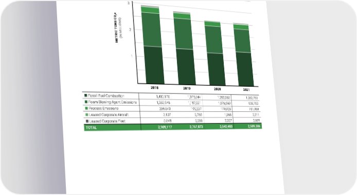 Scope 1 Emissions Breakdown ENVIRONMENTAL DATA EMISSIONS DATA Appendix C 2021 Owens Corning Sustainability Report | Appendices | 314 Fossil Fuel Combustion 1,412,175 1,375,344 1,282,583 1,382,753 Foam Blowing Agent Emissions 1,283,946 1,187,221 1,076,580 939,753 Process Emissions 206,840 199,237 179,928 181,980 Leased Corporate Aircraft 3,107 2,785 1,066 2,211 Leased Corporate Fleet 3,048 3,286 2,327 2,609 TOTAL 2,909,117 2,767,873 2,542,483 2,509,306 2018 2019 2020 2021 4 3 2 1 METRIC TONS C0 2 e (IN MILLIONS)