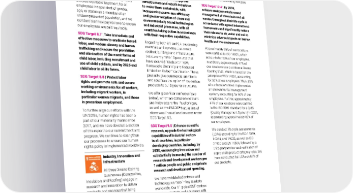 2021 Owens Corning Sustainability Report | Our Approach | UN SDG Alignment | 48 SDG Target 8.5 | By 2030, achieve full and productive employment and decent work for all women and men, including for young people and persons with disabilities, and equal pay for work of equal value. A consistent philosophy in the design, application, and administration of total compensation programs globally ensures equitable treatment for all employees independent of gender, age, or status as a member of an underrepresented population, and we conduct biannual pay reviews to ensure our employees are paid equitably. SDG Target 8.7 | Take immediate and effective measures to eradicate forced labor, end modern slavery and human trafficking and secure the prohibition and elimination of the worst forms of child labor, including recruitment and use of child soldiers, and by 2025 end child labor in all its forms. SDG Target 8.8 | Protect labor rights and promote safe and secure working environments for all workers, including migrant workers, in particular women migrants, and those in precarious employment. To further align our efforts with the UN SDGs, human rights has been a part of our materiality matrix since 2017, and we have devoted a section of this report to our commitment and progress. We continue to strengthen our processes to ensure our human rights policy is implemented worldwide. Industry, Innovation and Infrastructure All three Owens Corning businesses (Composites, Insulation, and Roofing) engage in research and innovation to deliver products and services that bring performance and durability to infrastructure and the built environment. SDG Target 9.1 | Develop quality, reliable, sustainable and resilient infrastructure, including regional and transborder infrastructure, to support economic development and human well-being, with a focus on affordable and equitable access for all. SDG Target 9.4 | By 2030, upgrade infrastructure and retrofit industries to make them sustainable, with increased resource-use efficiency and greater adoption of clean and environmentally sound technologies and industrial processes, with all countries taking action in accordance with their respective capabilities. Regarding both 9.1 and 9.4, we develop materials and systems that create resilient buildings and infrastructure. We currently have 15 products that have received “Made with 100% Renewable Electricity and Reduced Embodied Carbon” certification. These products give commercial architects and specifiers the option of low-carbon products to build greener structures. We offer glass-fiber reinforced bars (rebar), which are corrosion-resistant and helps extend the life of bridges, as well as the PAROC ® Natura line of stone wool insulation discussed under SDG Target 8.2. SDG Target 9.5 | Enhance scientific research, upgrade the technological capabilities of industrial sectors in all countries, in particular developing countries, including, by 2030, encouraging innovation and substantially increasing the number of research and development workers per 1 million people and public and private research and development spending. We have established science and technology centers in key markets worldwide. Our 11 global S&T centers employ scientists and engineers with expertise in a wide range of disciplines, including glass science, chemical engineering, fundamental chemistry, and much more. Our S&T organization includes close to 450 people. Responsible Consumption and Production The sustainability practices we have in place for our operations and supply chain reflect the attention to product sustainability and reducing our manufacturing footprint. SDG Target 12.4 | By 2030, achieve environmentally sound management of chemicals and all wastes throughout their life cycle in accordance with agreed international frameworks and significantly reduce their release to air, water and soil to minimize adverse impacts on human health and the environment. Approximately 36% of our locations were certified to ISO 14001, which accounts for 50% of our employees. In addition, approximately 47% of our locations use our internal Owens Corning EMS, which is based on the principles of ISO 14001, accounting for 36% of our employees. Thus, 83% of our locations have implemented an environmental management system, accounting for 86% of our employees. Further, approximately 47% of our locations were certified to the ISO 9001 standard for a QMS (Quality Management System) in 2021, representing approximately 62% of our employees. We conduct life cycle assessments (LCAs) according to the ISO 14040, 14044, and 14025, as well as ISO 21930 and EN 15804, followed by a third-party review and verification of appropriate product category rules. We have conducted full LCAs on 81% of our products.