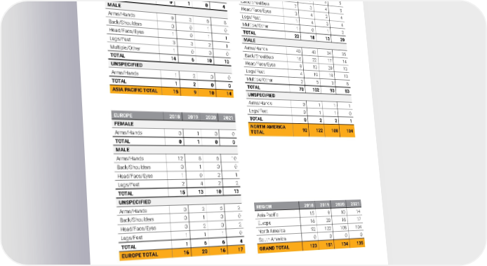 Region/Gender/Injury Type + WORKFORCE DATA SAFETY DATA Appendix B 2021 Owens Corning Sustainability Report | Appendices | 300 ASIA PACIFIC 2018 2019 2020 2021 FEMALE Arms/Hands 0 1 0 3 Legs/Feet 0 0 0 1 TOTAL 0 1 0 4 MALE Arms/Hands 9 3 6 8 Back/Shoulders 0 0 1 0 Head/Face/Eyes 1 0 1 1 Legs/Feet 3 3 2 1 Multiple/Other 1 0 0 0 TOTAL 14 6 10 10 UNSPECIFIED Arms/Hands 1 2 0 0 TOTAL 1 2 0 0 ASIA PACIFIC TOTAL 15 9 10 14 EUROPE 2018 2019 2020 2021 FEMALE Arms/Hands 0 1 0 0 TOTAL 0 1 0 0 MALE Arms/Hands 12 8 6 10 Back/Shoulders 0 1 0 0 Head/Face/Eyes 1 0 2 1 Legs/Feet 2 4 2 2 TOTAL 15 13 10 13 UNSPECIFIED Arms/Hands 0 2 5 2 Back/Shoulders 0 1 0 0 Head/Face/Eyes 0 2 0 2 Legs/Feet 1 1 1 0 TOTAL 1 6 6 4 EUROPE TOTAL 16 20 16 17 NORTH AMERICA 2018 2019 2020 2021 FEMALE Arms/Hands 10 7 3 5 Back/Shoulders 7 3 4 5 Head/Face/Eyes 3 4 2 4 Legs/Feet 1 4 3 4 Multiple/Other 1 0 1 2 TOTAL 22 18 13 20 MALE Arms/Hands 40 43 34 35 Back/Shoulders 15 22 17 14 Head/Face/Eyes 9 13 20 13 Legs/Feet 4 19 19 13 Multiple/Other 2 5 3 8 TOTAL 70 102 93 83 UNSPECIFIED Arms/Hands 0 1 1 1 Legs/Feet 0 1 1 0 TOTAL 0 2 2 1 NORTH AMERICA TOTAL 92 122 108 104 REGION 2018 2019 2020 2021 Asia Pacific 15 9 10 14 Europe 16 20 16 17 North America 92 122 108 104 South America 0 0 0 0 GRAND TOTAL 123 151 134 135