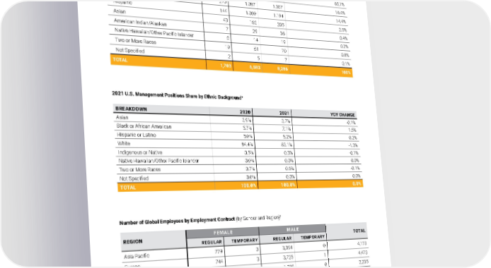 WORKFORCE DATA EMPLOYEE DATA Appendix B 2021 Owens Corning Sustainability Report | Appendices | 294 2021 Ethnic Background of Non-Contingent U.S. Employees + 2021 U.S. Management Positions Share by Ethnic Background + Number of Global Employees by Employment Contract (by Gender and Region) + REGION FEMALE MALE TOTAL REGULAR TEMPORARY REGULAR TEMPORARY Asia Pacific 779 0 3,394 0 4,173 Europe 744 3 3,725 1 4,473 Latin America 446 0 1,789 0 2,235 North America 1,817 0 7,058 1 8,876 TOTAL 3,786 3 15,966 2 19,757 ETHNIC BACKGROUND FEMALE MALE TOTAL SHARE IN TOTAL WORKFORCE White 1,213 4,185 5,398 65.1% Black 270 1,087 1,357 16.4% Hispanic 144 1,050 1,194 14.4% Asian 43 162 205 2.5% American Indian/Alaskan 7 29 36 0.4% Native Hawaiian/Other Pacific Islander 5 14 19 0.2% Two or More Races 19 51 70 0.8% Not Specified 2 5 7 0.1% TOTAL 1,703 6,583 8,286 100% BREAKDOWN 2020 2021 YOY CHANGE Asian 3.9% 3.7% -0.1% Black or African American 5.7% 7.1% 1.5% Hispanic or Latino 5.0% 5.2% 0.2% White 84.4% 83.1% -1.3% Indigenous or Native 0.5% 0.3% -0.1% Native Hawaiian/Other Pacific Islander 0.0% 0.0% 0.0% Two or More Races 0.7% 0.6% -0.1% Not Specified 0.0% 0.0% 0.0% TOTAL 100.0% 100.0% 0.0%