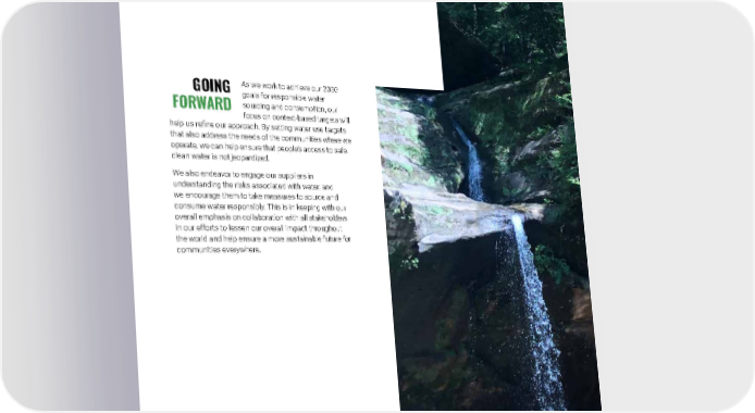 2021 Owens Corning Sustainability Report | Reducing Our Environmental Footprint | Responsible Water | 177 GOING FORWARD As we work to achieve our 2030 goals for responsible water sourcing and consumption, our focus on context-based targets will help us refine our approach. By setting water use targets that also address the needs of the communities where we operate, we can help ensure that people’s access to safe, clean water is not jeopardized. We also endeavor to engage our suppliers in understanding the risks associated with water, and we encourage them to take measures to source and consume water responsibly. This is in keeping with our overall emphasis on collaboration with all stakeholders in our efforts to lessen our overall impact throughout the world and help ensure a more sustainable future for communities everywhere. Photo submitted by: Kevin Bohne | Toledo, Ohio, U.S. Hocking Hills, Ohio, U.S.