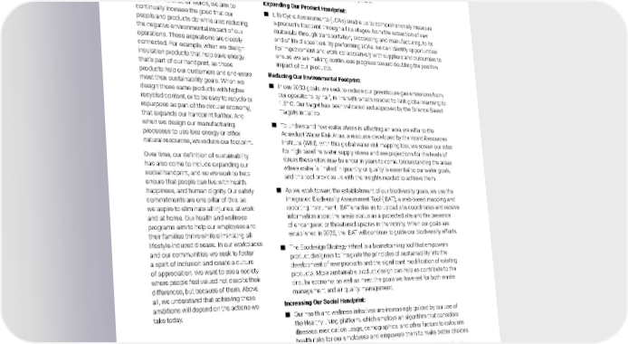 2021 Owens Corning Sustainability Report | Overview | Our Sustainability Aspirations | 14 Data-Driven Solutions for Sustainability Each step on our sustainability journey is measured against a set of quantifiable metrics and specific targets. As our journey has progressed, we have worked to develop data-driven methods that provide quantifiable measures of our improvement. The following examples demonstrate this commitment across all three of our key pillars: Expanding Our Product Handprint: ■ Life Cycle Assessments (LCAs) enable us to comprehensively measure a product’s footprint through all its stages, from the extraction of raw materials, through transportation, processing and manufacturing, to its end of life disposition. By performing LCAs, we can identify opportunities for improvement and work collaboratively with suppliers and customers to ensure we are making continuous progress toward doubling the positive impact of our products. Reducing Our Environmental Footprint: ■ In our 2030 goals, we seek to reduce our greenhouse gas emissions from our operations by half, in line with what’s needed to limit global warming to 1.5° C. Our target has been validated and approved by the Science Based Targets initiative. ■ To understand how water stress is affecting an area, we refer to the Aqueduct Water Risk Atlas, a resource developed by the World Resources Institute (WRI). With this global water risk mapping tool, we screen our sites for high baseline water supply stress and see projections for the levels of stress these sites may be under in years to come. Understanding the areas where water is limited in quantity or quality is essential to our water goals, and this tool provides us with the insights needed to achieve them. ■ As we work toward the establishment of our biodiversity goals, we use the Integrated Biodiversity Assessment Tool (IBAT), a web-based mapping and reporting instrument. IBAT enables us to upload site coordinates and receive information about the area’s status as a protected site and the presence of endangered or threatened species in the vicinity. When our goals are established in 2025, the IBAT will continue to guide our biodiversity efforts. ■ The Ecodesign Strategy Wheel is a brainstorming tool that empowers product designers to integrate the principles of sustainability into the development of new products and the significant modification of existing products. More sustainable product design can help us contribute to the circular economy, as well as meet the goals we have set for both waste management and air quality management. Increasing Our Social Handprint: ■ Our health and wellness initiatives are increasingly guided by our use of the Healthy Living platform, which employs an algorithm that considers illnesses, medication usage, demographics, and other factors to calculate health risks for our employees and empowers them to make better choices. ■ Historical data, current data, and key performance indicators provide our safety teams with the insights needed to track performance, identify trends, and tap into real-time metrics. We also continue to use safety dashboards and databases to further our efforts in that area. Learn more about Owens Corning’s sustainability goals and targets in the Summary & Highlights of this report. A Holistic Approach to Sustainability We believe that sustainability efforts should improve people’s quality of life. That view informs our aspirations to contribute to the health, safety, and well-being of people — and all living things — everywhere. It’s our goal to be a net-positive company, one whose handprint is greater than our footprint. In other words, we aim to continually increase the good that our people and products do while also reducing the negative environmental impact of our operations. These aspirations are closely connected. For example, when we design insulation products that help save energy, that’s part of our handprint, as those products help our customers and end-users meet their sustainability goals. When we design those same products with higher recycled content, or to be easy to recycle or repurpose as part of the circular economy, that expands our handprint further. And when we design our manufacturing processes to use less energy or other natural resources, we reduce our footprint. Over time, our definition of sustainability has also come to include expanding our social handprint, and so we work to help ensure that people can live with health, happiness, and human dignity. Our safety commitments are one pillar of this, as we aspire to eliminate all injuries, at work and at home. Our health and wellness programs aim to help our employees and their families thrive while eliminating all lifestyle-induced disease. In our workplaces and our communities, we seek to foster a spirit of inclusion and create a culture of appreciation. We want to see a society where people feel valued not despite their differences, but because of them. Above all, we understand that achieving these ambitions will depend on the actions we take today.