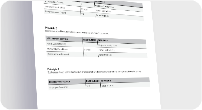 UN GLOBAL COMPACT COMMUNICATION ON PROGRESS INDEX Appendix E Principle 1 Businesses should support and respect the protection of internationally proclaimed human rights. 2021 REPORT SECTION PAGE NUMBER COMMENTS About Owens Corning 9 Corporate Equality Index Human Rights & Ethics 275-277 Human Rights Policy Compliance and Beyond 73 Code of Conduct Principle 2 Businesses should ensure that they are not complicit in human rights abuses. 2021 REPORT SECTION PAGE NUMBER COMMENTS About Owens Corning 9 Corporate Equality Index Human Rights & Ethics 275-277 Human Rights Policy Compliance and Beyond 73 Code of Conduct Principle 3 Businesses should uphold the freedom of association and the effective recognition of the right to collective bargaining. 2021 REPORT SECTION PAGE NUMBER COMMENTS Employee Experience 213 Labor Relations 2021 Owens Corning Sustainability Report | Appendices | 340