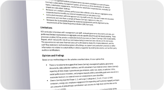 © SCS Global Services Page 2 of 5 Assurance Team and Methodology Our team was comprised of Tina Sentner, Dr. Gerard Mansell, Vincent Katharua , Tavio Benetti and Neil Mendenhall with qualifications available online and upon request. SCS’ Assurance Team undertook the following activities in order to render our opinion : § § Reviewed management systems and governance documents developed as a part of Owens Corning’s sustainability management system , which includes their identification of material topics , stakeholder engagement, mechanisms for stakeholder responsiveness , evaluation of impact and cal culation methods § § Reviewed and analyzed primary performance data collected at the site s and aggregated at the corporate level to identify any material mis statements or calculation errors. § § Conducted interviews with management and key staff in the US, Asia and Europe and requested procedures and data from a sample of Owens Corning’s regions and sites; and § § Review ed the Sustainability Report for material misstatements and its alignment to the requirements of the Global Reporting Initiative (GRI) Standards. Limitations SCS conducted interviews with management and staff, reviewed governance documents and data, and per formed limited recalculations on aggregate and site -specific data through risk -based sampling . These processes enabled SCS to provide a moderate level of assurance on Owens Corning’s 202 1 Sustainability Report, which reduces the risk of our conclusions be ing in error but does not reduce the risk to zero. The assurance did not cover financial data such as the balance sheet, the income statement, and the cash flow statement , technical descriptions of buildings, equipment and production processes or other information not related to sustainability or already supported by existing documents, such as third -party audits or certifications. Opinion and Findings Based on our methodo logy and the activities described above, it is our opinion that: § There is no evidence to suggest that Owens Corning’s management systems, governance documents, data collection methods, and KPI calculations have material errors. Owens Corning’s reporting o f 2021 Scope 3 greenhouse gas emissions, water use, waste, air pollution, VOCs, social performance indicators, and progress towards 2030 sustainability goals were assured at a moderate -level and no material errors or misstatements were identified. § Owens Corning reported Scope 1, 2, and scope 3 categories 1, 3, 4, 6, 7, 9 and 12 GHG emissions, energy us e, employee engagement (% responding and % actively engaged),and types and amounts of philanthropic contributions was assured at a high -level and this data can be considered reliable. § The Report adequately reflects the organization’s alignment to, and implementation of the AA1000AS v3 (2020) principles of Inclusivity, Materiality, Responsiveness, and Impact in its operations. Owens Corning has processes in p lace for consulting and engaging with its key stakeholders in a structured and systematic manner . 2021 Owens Corning Sustainability Report | Appendices | 346 ASSURANCE STATEMENT Appendix F