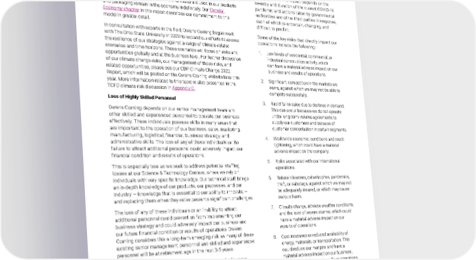 2021 Owens Corning Sustainability Report | Our Approach | Risk Management | 62 We also anticipate transitional risks as climate-change legislation and other environmental mandates lead to increases in energy prices. This can have an adverse effect on our operations, as it can represent a cost increase that we may not be able to pass along to the customer. Owens Corning has strategies in place to mitigate these risks. Chief among them is our commitment to the circular economy model, in which we work to avoid the use of virgin raw materials whenever possible, manufacture products to deliver the least negative environmental impact, and ensure that materials used in our products and packaging remain in the economy indefinitely. Our Circular Economy chapter in this report describes our commitment to this model in greater detail. In consultation with experts in the field, Owens Corning began work with The Ohio State University in 2020 to expand our efforts to assess the resilience of our strategies against a range of climate-related scenarios and time horizons. These scenarios will focus on risks and opportunities globally and at the business level. For further discussion of our climate change risks, our management of those risks, and related opportunities, please see our CDP Climate Change 2022 Report, which will be posted on the Owens Corning website later this year. More information related to this topic is also presented in the TCFD climate risk discussion in Appendix G. Loss of Highly Skilled Personnel Owens Corning depends on our senior management team and other skilled and experienced personnel to operate our business effectively. These individuals possess skills in many areas that are important to the operation of our business, sales, marketing, manufacturing, logistical, financial, business strategy, and administrative skills. The loss of any of these individuals or the failure to attract additional personnel could adversely impact our financial condition and results of operations. This is especially true as we seek to address potential staffing losses at our Science & Technology Centers, where we rely on individuals with very specific knowledge. Our technical staff brings an in-depth knowledge of our products, our processes, and our industry — knowledge that is essential to our ability to innovate — and replacing them when they retire presents significant challenges. The loss of any of these individuals or an inability to attract additional personnel could prevent us from implementing our business strategy and could adversely impact our business and our future financial condition or results of operations. Owens Corning considers this a long-term emerging risk as many of these existing senior management personnel and skilled and experienced personnel will be at retirement age in the next 3-5 years. We are working to mitigate this risk through phased retirement, which helps create a smooth transition for employees as they retire. This includes a program through which employees nearing retirement are given the opportunity to work parttime while still receiving full-time benefits. As employees prepare for retirement, they can pass along their insights and expertise, helping ensure that Owens Corning has the opportunity to continue moving forward with minimal disruption. Additional Risks Our 2021 Annual Report on Form 10-K offers an in-depth discussion of our quantitative and qualitative risks, as well as our approach for managing them. The impact of the COVID-19 pandemic may exacerbate the risks discussed in this section. The impact depends on the severity and duration of the current COVID-19 pandemic and actions taken by governmental authorities and other third parties in response, each of which is uncertain, changing, and difficult to predict. Some of the key risks that directly impact our operations include the following: 1. Low levels of residential, commercial, or industrial construction activity, which can have a material adverse impact on our business and results of operations. 2. Significant competition in the markets we serve, against which we may not be able to compete successfully. 3. Rapid fall in sales due to declines in demand. This can occur because we do not operate under long-term volume agreements to supply our customers and because of customer concentration in certain segments. 4. Worldwide economic conditions and credit tightening, which could have a material adverse impact on the company. 5. Risks associated with our international operations. 6. Natural disasters, catastrophes, pandemics, theft, or sabotage, against which we may not be adequately insured, or which may cause serious harm. 7. Climate change, adverse weather conditions, and the level of severe storms, which could have a material adverse impact on our results of operations. 8. Cost increases or reduced availability of energy, materials, or transportation. This could reduce our margins and have a material adverse impact on our business, financial condition, and results or operations. 9. Risks associated with our efforts in acquiring and integrating other businesses, establishing joint ventures, expanding our production capacity, or divesting assets.