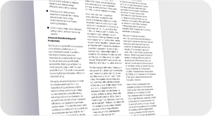 2021 Owens Corning Sustainability Report | Expanding Our Product Handprint | Sustainable Growth | 113 ■ Partnering and collaborating with builders, contractors, architects, and homeowners to understand their needs and help them leverage leading-edge building science to adapt to better building products and systems. ■ Using science and technology to develop innovative building products and systems to improve durability and deliver energy efficiency and building comfort. ■ Sharing our building science expertise to educate the industry and advocate for building code improvements and green building standards. ■ Continuing to make our employees’ safety, health, and wellness a top priority. Advanced Manufacturing and Productivity Our focus on capital efficiency enables us to achieve a better return on our investment overall. In addition, the Owens Corning advanced manufacturing team looks for ways to use all resources as efficiently as possible, helping us achieve the most possible output with the least possible input. This work is supported by our digital transformation efforts in manufacturing. We apply advanced process controls to increase predictability in our manufacturing processes, which leads to better products and helps us use materials more effectively, reducing cost and our footprint. As an additional benefit of our increased efficiency, our operations are more stable overall. This has the potential to contribute to safety within our facilities, as employees are less likely to be in unplanned or unexpected situations. All told, improving productivity through advanced manufacturing enables growth that aligns with our aspiration to be a net-positive company. Promotion and Advocacy Owens Corning’s advocacy objectives include support for initiatives that align with our core values, especially as they relate to energy efficiency measures and contemporary building code development and adoption. Our efforts to promote our products take many forms, including education campaigns, code advocacy, attention to legislation and regulation related to wildfires, work with the insurance industry, and more. As an example, over the past few years, attention has turned to the codes and standards that apply to the fire performance of products and wall systems. In response to wildfires on the west coast of the U.S., as well as fires in the U.K., Europe, and the Middle East, we expect to see municipalities and possibly even state governments adopt code requirements that drive the market toward non-combustible materials such as Thermafiber ® mineral wool insulation. In addition, expansion of zero-energy code policies in places like California would call for increased R-value per inch, and this could further drive the market toward Thermafiber ® insulation and our other higher R-value insulation products. We also engage with policy makers, with our government affairs team overseeing our interactions and ensuring that our activities are aligned with our climate policy. We regularly review language and activities with both the external affairs and sustainability departments and conduct legal reviews of all external communications including letters, testimony, and activities with outside advocates or NGOs. Owens Corning’s political advocacy objectives are to support initiatives that align with the company’s core values, namely advocating for energy efficiency measures, and for contemporary building code development and adoption. Partnerships with Industry Organizations Our collaborations with the organizations active in our industry provide us with invaluable insights as we seek to improve our sustainability capabilities, and they offer opportunities to collectively advocate for our industry, which in turn promotes growth. Owens Corning employees work with trade associations and research institutions, as well as the organizations that set codes and specifications for the buildings and products that use our materials. Our experts often participate as board and committee members in these organizations, providing leadership that incorporates our strong sustainability standards. The North American Insulation Manufacturers Association (NAIMA) is made up of companies that manufacture fiberglass, rock wool, and slag wool insulation. Its members produce the majority of the insulation products used in the United States, Canada, and Mexico. NAIMA is primarily focused on promoting energy efficiency and the preservation of the environment, as well as the safe production and use of its members’ products. Owens Corning is also a member of the European Insulation Manufacturers Association (EURIMA), which represents the interests of all major mineral wool producers throughout Europe. Owens Corning employees hold leadership positions in the Asphalt Roofing Manufacturers Association (ARMA), which represents both manufacturers and the companies that supply their raw materials. ARMA is dedicated to the advancement of the asphalt roofing industry through the collective expertise of its member companies, and the organization is also a resource for building and code officials, as well as regulatory agencies and allied trade groups. Our employees have leadership positions with this organization, including chairing the Asphalt Roofing Recycling Committee and Codes Steering Group. Our employees are also active in the Asphalt Institute and Asphalt Institute Foundation and have leadership