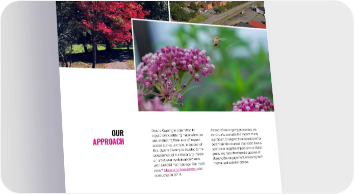 2021 Owens Corning Sustainability Report | Our Approach | Stakeholder Engagement & Material Issues | 35 OUR APPROACH Owens Corning is committed to objectively identifying material issues and evaluating their level of impact across our value chain. In support of this, Owens Corning is devoted to the assessment of our materiality matrix on a five-year cycle in accordance with AA1000 methodology. Our most recent Materiality Assessment was conducted in 2019. As part of our ongoing processes, we continue to evaluate the impact of any significant changes to our operations for potential risks or areas that could have a positive or negative impact on our stated goals. We have developed a process of stakeholder engagement, reviewing both internal and external groups. Photos submitted by: Susan Raneri | Massachusetts, U.S. Golf course, Northborough, Massachusetts. Karolina Koscianska | Trzemeszno, Poland (top, right) Mineral wool manufacturing plant in Hässleholm, Sweden. Danielle Wittorp | Dearborn, Michigan, U.S. (bottom, right) Flower garden.
