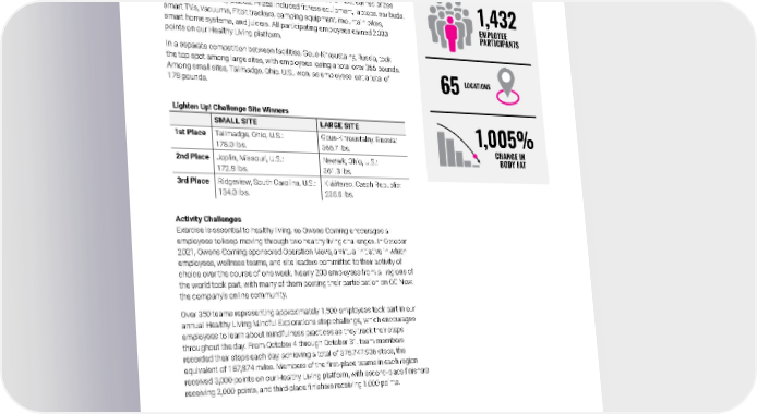 2021 Owens Corning Sustainability Report | Expanding Our Social Handprint | Health & Wellness | 271 Healthy Competition for Healthy Habits Lighten Up! Weight-Loss Challenge From May 3 to August 6, employees around the globe lost 4,287 pounds (1,945 kg) as part of the 2021 Lighten Up! challenge. A total of 1,432 employees from 65 locations participated in this year’s weight loss competition. Participating employees measured their body composition every two weeks for three months. The three female and three male participants who lost the most earned prizes based on where they placed. Prizes included fitness equipment, laptops, ear buds, smart TVs, vacuums, Fitbit trackers, camping equipment, mountain bikes, smart home systems, and juicers. All participating employees earned 2,000 points on our Healthy Living platform. In a separate competition between facilities, Gous-Khroustalny, Russia, took the top spot among large sites, with employees losing a total over 366 pounds. Among small sites, Tallmadge, Ohio, U.S., won, as employees lost a total of 178 pounds. Lighten Up! Challenge Site Winners SMALL SITE LARGE SITE 1st Place Tallmadge, Ohio, U.S.: 178.0 lbs. Gous-Khroustalny, Russia: 366.7 lbs. 2nd Place Joplin, Missouri, U.S.: 172.8 lbs. Newark, Ohio, U.S.: 361.3 lbs. 3rd Place Ridgeview, South Carolina, U.S.: 134.0 lbs. Klášterec, Czech Republic: 235.5 lbs. 4,287 TOTAL WEIGHT LOST 1,432 EMPLOYEE PARTICIPANTS 1,005% CHANGE IN BODY FAT 65 LOCATIONS Activity Challenges Exercise is essential to healthy living, so Owens Corning encourages all employees to keep moving through two healthy living challenges. In October 2021, Owens Corning sponsored Operation Move, a virtual initiative in which employees, wellness teams, and site leaders committed to their activity of choice over the course of one week. Nearly 200 employees from all regions of the world took part, with many of them posting their participation on OC Now, the company’s online community. Over 350 teams representing approximately 1,500 employees took part in our annual Healthy Living Mindful Explorations step challenge, which encourages employees to learn about mindfulness practices as they track their steps throughout the day. From October 4 through October 31, team members recorded their steps each day, achieving a total of 375,747,906 steps, the equivalent of 187,874 miles. Members of the first-place teams in each region received 3,000 points on our Healthy Living platform, with second-place finishers receiving 2,000 points, and third-place finishers receiving 1,000 points.