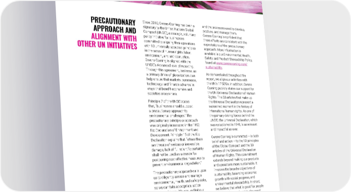 2021 Owens Corning Sustainability Report | Appendices | 290 Since 2010, Owens Corning has been a signatory to the United Nations Global Compact (UNGC), a strategic, voluntary policy initiative for businesses committed to aligning their operations with 10 universally accepted principles in the areas of human rights, labor, environment, and anti-corruption. Owens Corning is aligned with the UNGC’s Advanced level of reporting. Through this agreement, business, as a primary driver of globalization, can help ensure that markets, commerce, technology, and finance advance in ways that benefit economies and societies everywhere. Principle 7 of the UNGC states that, “businesses should support a precautionary approach to environmental challenges.” The precautionary principle or approach was originally introduced in the 1992 Rio Declaration of Environment and Development. Principle 15 of the Rio Declaration explains that, “where there are threats of serious or irreversible damage, lack of full scientific certainty shall not be used as a reason for postponing cost-effective measures to prevent environmental degradation.” The precautionary approach calls upon us to diligently assess and manage environmental, health, and safety risks, so we can take appropriate action to prevent harm. We ensure that our products and technology comply with or exceed all applicable laws, regulations, and approval standards to protect the environment and human life and health. In addition, our product stewardship programs are designed to ensure the integrity of our products PRECAUTIONARY APPROACH AND ALIGNMENT WITH OTHER UN INITIATIVES and the processes used to develop, produce, and manage them. Owens Corning is confident that these efforts are consistent with the expectations of the precautionary approach. More information is available in our Environmental, Health, Safety, and Product Stewardship Policy, found at www.owenscorning.com/ sustainability . As demonstrated throughout the report, we align our activities with the UN’s 17 SDGs. In addition, Owens Corning publicly states our support for the UN Universal Declaration of Human Rights. The 30 articles that make up the Universal Declaration represent a watershed moment in the history of international human rights. As one of the primary driving forces behind the UNGC, the Universal Declaration, which was established in 1948, is as relevant and impactful as ever. Owens Corning is committed — in both belief and action — to the 10 principles of the Global Compact and the 30 articles of the Universal Declaration of Human Rights. This commitment extends beyond making our products and operations more sustainable. It involves the broader objectives of sustainability, balancing economic growth with social progress, and environmental stewardship. In short, we believe that what is good for people and good for our planet is also good for Owens Corning. Our Human Rights Policy was updated and expanded in December 2016 and informs our Supplier Code of Conduct, all in accordance with the principles of the UNGC and the Universal Declaration of Human Rights. Photo submitted by: Lori Strohmaier | Toledo, Ohio, U.S. A bee pollinating a flower.