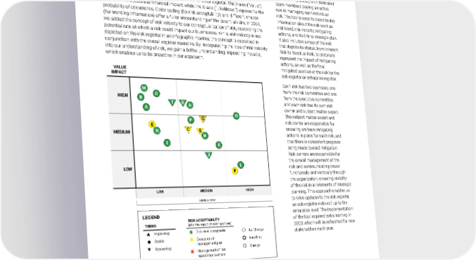 2021 Owens Corning Sustainability Report | Our Approach | Risk Management | 59 Risk Registers Owens Corning’s business units proactively analyze risks and create business- and function-specific risk registers. We currently have an enterprise risk register and sub-registers for each of our three businesses, as well as compliance and finance. The risk committee uses these individual risk registers to create an enterprise risk register, which enables business units and the risk committee to facilitate strategic and operational planning processes while mitigating sustainability and other risks. Risks are prioritized based on their placement in the risk register. The Y-axis (“Value”) represents the potential financial impact, while the X-axis (“Likelihood”) represents the probability of occurrence. Color coding (for risk acceptability) and different shapes (for trending information) offer a fuller understanding of the potential risks. In 2021, we added the concept of risk velocity to our conceptualization of risk, describing the potential rate at which a risk could impact our businesses. While risk velocity is not depicted on the risk register in an infographic manner, the concept is described in conjunction with the overall register narrative. By incorporating the idea of risk velocity into our understanding of risk, we gain a better understanding impending impacts, which enables us to be proactive in our approach. To identify new risks — and update risks no longer considered important — the risk committee conducts quarterly reviews of results and outputs of risk assessments. The risk committee’s quarterly meetings enable them to review and report on robust mitigation plans across businesses as well as corporate functions. Our ERM process is also reviewed quarterly by the audit committee of the board to ensure it remains relevant and proactive. Risk on a Page Owens Corning encourages active learning through risk mapping, and in 2020 we implemented a new tool called Risk on a Page. The new model requires each risk to be presented separately, with dedicated team members playing an active role in managing each individual risk. The tool is used to describe key information about the risk such as risk trend, risk velocity, mitigating actions, and its link to strategic plan. It also includes a map of the risk that depicts its status, from Inherent Risk to Residual Risk, to pictorially represent the impact of mitigating actions, as well as the final mitigated position of the risk for the sub-register or enterprise register. Each risk has two sponsors, one from the risk committee and one from the executive committee, and each risk has its own risk owner and subject matter expert. The subject matter expert and risk owner are responsible for ensuring we have mitigating actions in place for each risk, and that there is consistent progress being made toward mitigation. Risk owners are responsible for the overall management of the risk and communicating cross- functionally and vertically through the organization, ensuring visibility of the risk in all elements of strategic planning. This approach enables us to drive updates to the risk register, as sub-register risks roll up to the enterprise level. The implementation of the tool required extra training in 2020, which will be refreshed for new stakeholders each year. VALUE IMPACT HIGH MEDIUM LOW LOW MEDIUM HIGH T A B M G U R P N I H K J O L E C S Q F LIKELIHOOD TREND ▲ Improving ● Stable ▼ Worsening RISK ACCEPTABILITY (after the impact of existing actions) ■ Risk level acceptable ■ Execution of management plan ■ Management of risk needs improvement No Change New Risk Change LEGEND Example of a risk register for demonstration purposes.
