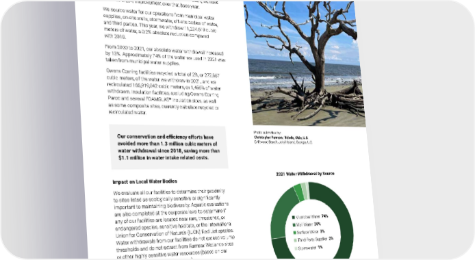 2021 Owens Corning Sustainability Report | Reducing Our Environmental Footprint | Responsible Water | 175 Impact on Local Water Bodies We evaluate all our facilities to determine their proximity to sites listed as ecologically sensitive or significantly important to maintaining biodiversity. Aquatic evaluations are also completed at the corporate level to determine if any of our facilities are located near rare, threatened, or endangered species, sensitive habitats, or the International Union for Conservation of Nature’s (IUCN) Red List species. Water withdrawals from our facilities do not exceed volume thresholds and do not extract from Ramsar Wetlands sites or other highly sensitive water resources (based on our knowledge of suppliers and sources). Owens Corning is not impacting any special protected bodies of water and related habitats, as defined at the country level by the UN World Heritage Sites, UN Biosphere Sites, or Ramsar Wetlands. This determination is based on an evaluation conducted annually by Owens Corning, which continues to demonstrate our manufacturing sites’ lack of proximity to these special sites or species. WATER SOURCING & CONSUMPTION PERFORMANCE Using 2018 as our base year, we have set a goal to achieve a 50% aggregate intensity reduction of water withdrawal in high water-stress sites by 2030. At the end of 2021, we have achieved a 20% improvement over that base year. We source water for our operations from municipal water supplies, on-site wells, stormwater, off-site bodies of water, and third parties. This year, we withdrew 11,234,619 cubic meters of water, a 0.2% absolute reduction compared with 2018. From 2020 to 2021, our absolute water withdrawal increased by 13%. Approximately 74% of the water we used in 2021 was taken from municipal water supplies. Owens Corning facilities recycled a total of 2%, or 272,867 cubic meters, of the water we withdrew in 2021, and we recirculated 166,919,042 cubic meters, or 1,486% of water withdrawn. Insulation facilities, excluding Owens Corning Paroc and several FOAMGLAS ® insulation sites, as well as some composite sites, currently calculate recycled or recirculated water. 2021 Water Withdrawal by Source Municipal Water 74% Well Water 20% Surface Water 3% Third-Party Supplier 2% Stormwater 1% Our conservation and efficiency efforts have avoided more than 1.3 million cubic meters of water withdrawal since 2018, saving more than $1.1 million in water intake related costs. Photo submitted by: Christopher Pawson | Toledo, Ohio, U.S. Driftwood Beach, Jekyll Island, Georgia, U.S.