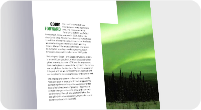 2021 Owens Corning Sustainability Report | Reducing Our Environmental Footprint | Combating Climate Change | 158 Photo submitted by: Abigail Sprague | Wabash, Indiana, U.S. Aurora Borealis, Fairbanks, Alaska, U.S. GOING FORWARD The need to combat climate change grows more urgent each year. The Intergovernmental Panel on Climate Change’s Sixth Assessment Report, released in 2021, makes this abundantly clear. As scientists observe climate change in real time all over the globe, they note that its effects are accelerating and intensifying to an alarming degree. Many of the impacts of climate change can be mitigated by acting to reduce greenhouse gas emissions now, and this informs our 2030 goals. Reducing our Scope 1 and Scope 2 emissions by 50% is an ambitious goal, but it is what is required to limit global warming to under 1.5° C and the progress we have made gives us reason to be optimistic. We believe our people have the talent and the drive to accomplish this goal, and we are confident that we can work with our suppliers to reduce our Scope 3 emissions as well. The internal and external collaboration required to meet our goals is already built into our approach to combating climate change. We recognize that this level of collaboration is imperative — the threat of climate change continues to grow, and it can only be diminished through a concerted effort on the part of individuals, corporations, organizations, and governments around the world.