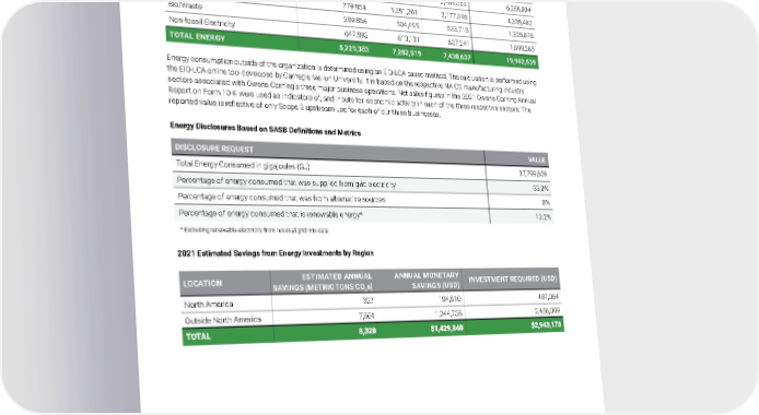 ENVIRONMENTAL DATA ENERGY DATA Appendix C 2021 Owens Corning Sustainability Report | Appendices | 311 2021 Total Energy Consumed in Our Value Chain (in Megawatt Hours) Energy consumption outside of the organization is determined using an EIO-LCA based method. The calculation is performed using the EIO-LCA online tool developed by Carnegie Mellon University. It is based on the respective NAICS manufacturing industry sectors associated with Owens Corning’s three major business operations. Net sales figures in the 2021 Owens Corning Annual Report on Form 10-K were used as indicators of, and inputs for, economic activity in each of the three respective sectors. The reported value is reflective of only Scope 3 upstream use for each of our three businesses. Energy Disclosures Based on SASB Definitions and Metrics 2021 Estimated Savings from Energy Investments by Region LOCATION ESTIMATED ANNUAL SAVINGS (METRIC TONS CO 2 e ) ANNUAL MONETARY SAVINGS (USD) INVESTMENT REQUIRED (USD) North America 527 184,610 487,084 Outside North America 7,801 1,244,738 2,456,089 TOTAL TOTAL 8,328 8,328 $1,429,348 $1,429,348 $2,943,173 $2,943,173 CATEGORY COMPOSITES INSULATION ROOFING TOTAL Coal 1,684,496 2,742,252 1,592,983 6,019,732 Natural Gas 1,827,273 2,041,379 2,489,353 6,358,004 Petrol 779,854 1,381,261 2,177,346 4,338,462 Bio/Waste 289,868 504,495 533,713 1,328,076 Non-fossil Electricity 647,893 613,131 637,241 1,898,265 TOTAL ENERGY 5,229,383 7,282,519 7,430,637 19,942,539 DISCLOSURE REQUEST VALUE Total Energy Consumed in gigajoules (GJ) 37,799,859 Percentage of energy consumed that was supplied from grid electricity 33.0% Percentage of energy consumed that was from alternative sources 0% Percentage of energy consumed that is renewable energy* 13.2% * Excluding renewable electricity from residual grid mix data