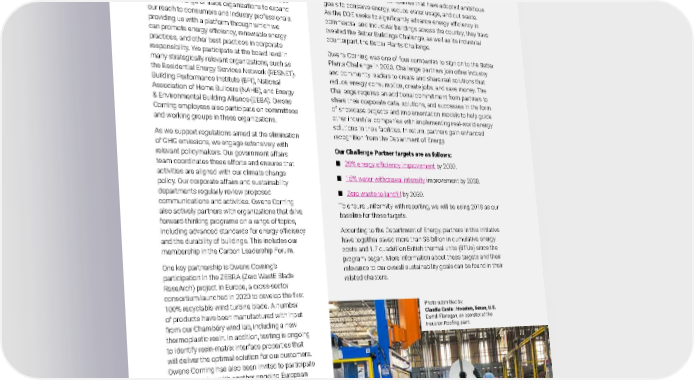 2021 Owens Corning Sustainability Report | Our Approach | UN SDG Alignment | 50 SDG Target 17.17 | Encourage and promote effective public, public-private and civil society partnerships, building on the experience and resourcing strategies of partnerships. As part of our work to combat climate change and advance sustainability, we increasingly engage with external parties with which we can leverage our expertise and our products. We have partnered with a wide range of trade organizations to expand our reach to consumers and industry professionals, providing us with a platform through which we can promote energy efficiency, renewable energy practices, and other best practices in corporate responsibility. We participate at the board level in many strategically relevant organizations, such as the Residential Energy Services Network (RESNET), Building Performance Institute (BPI), National Association of Home Builders (NAHB), and Energy & Environmental Building Alliance (EEBA). Owens Corning employees also participate on committees and working groups in these organizations. As we support regulations aimed at the elimination of GHG emissions, we engage extensively with relevant policymakers. Our government affairs team coordinates these efforts and ensures that activities are aligned with our climate change policy. Our corporate affairs and sustainability departments regularly review proposed communications and activities. Owens Corning also actively partners with organizations that drive forward-thinking programs on a range of topics, including advanced standards for energy efficiency and the durability of buildings. This includes our membership in the Carbon Leadership Forum. One key partnership is Owens Corning’s participation in the ZEBRA (Zero WastE Blade ReseArch) project in Europe, a cross-sector consortium launched in 2020 to develop the first 100% recyclable wind turbine blade. A number of products have been manufactured with input from our Chambéry wind lab, including a new thermoplastic resin. In addition, testing is ongoing to identify resin-matrix interface properties that will deliver the optimal solution for our customers. Owens Corning has also been invited to participate and is engaging with another ongoing European consortium focused on deconstructing and recycling first generation wind turbine blades. These blades use thermoset resins which by design are more difficult to deconstruct and recycle. Owens Corning will be exploring options to rejuvenate recovered glass fibers from these processes or remelt in our production facilities which effectively converts unusable glass to new glass made from recycled content. The Better Plants Program, part of the U.S. Department of Energy’s Better Buildings Initiative, is composed of over 250 companies that have adopted ambitious goals to conserve energy, reduce water usage, and cut waste. As the DOE seeks to significantly advance energy efficiency in commercial and industrial buildings across the country, they have created the Better Buildings Challenge, as well as its industrial counterpart, the Better Plants Challenge. Owens Corning was one of four companies to sign on to the Better Plants Challenge in 2020. Challenge partners join other industry and community leaders to create and share real solutions that reduce energy consumption, create jobs, and save money. The Challenge requires an additional commitment from partners to share their corporate data, solutions, and successes in the form of showcase projects and implementation models to help guide other industrial companies with implementing real-world energy solutions in their facilities. In return, partners gain enhanced recognition from the Department of Energy. Our Challenge Partner targets are as follows: ■ 28% energy efficiency improvement by 2030. ■ 15% water withdrawal intensity improvement by 2030. ■ Zero waste-to-landfill by 2030. To ensure uniformity with reporting, we will be using 2018 as our baseline for these targets. According to the Department of Energy, partners in this initiative have together saved more than $8 billion in cumulative energy costs and 1.7 quadrillion British thermal units (BTUs) since the program began. More information about these targets and their relevance to our overall sustainability goals can be found in their related chapters. THE BETTER PLANTS CHALLENGE Photo submitted by: Claudia Cantu | Houston, Texas, U.S. Darrell Flanagan, an operator at the Houston Roofing plant.