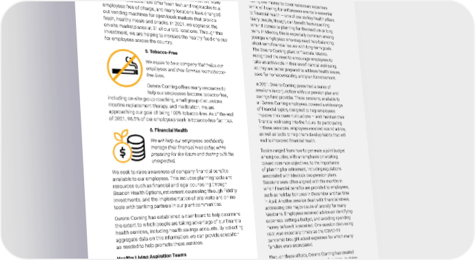 2021 Owens Corning Sustainability Report | Expanding Our Social Handprint | Health & Wellness | 266 4. Nutrition We aspire to help all Owens Corning employees and their families eliminate key health risks that result from poor nutritional education and unhealthy food choices. Unhealthy food choices can lead to serious health risks. Owens Corning aims to help employees and their families eliminate those risks by providing nutritional education. Many of our U.S. locations now offer fresh fruit and vegetables to all employees free of charge, and many locations have changed out vending machines for open kiosk markets that provide fresh, healthy meals and snacks. In 2021, we upgraded the on-site marketplaces at 31 of our U.S. locations. Through this investment, we are helping to increase the healthy food choices for employees across the country. 5. Tobacco-Free We aspire to be a company that helps our employees and their families lead tobacco- free lives. Owens Corning offers many resources to help our employees become tobacco-free, including on-site group coaching, small group discussions, nicotine replacement therapy, and medication. We are approaching our goal of being 100% tobacco-free. As of the end of 2021, 98.5% of our employees work in tobacco-free facilities. 6. Financial Health We will help our employees confidently manage their financial lives today, while preparing for the future and dealing with the unexpected. We seek to raise awareness of company financial benefits available to our employees. This includes planning tools and resources such as financial and legal counseling through Beacon Health Options, retirement counseling through Fidelity Investments, and the implementation of site visits and online tools with banking partners in our plant communities. Owens Corning has established a dashboard to help determine the extent to which people are taking advantage of our financial health services, including health savings accounts. By collecting aggregate data on this information, we can provide education as needed to help promote these services. Healthy Living Aspiration Teams To help support these six pillars, Owens Corning has established Healthy Living Aspiration Teams. Each team is led by a plant leader and supported by human resources, EHS, occupational health, benefits, and other key resources from each of our businesses to ensure healthy living goals align with their pillar and have a positive impact on all employees. The aspiration teams have led us through the development of tools and resources used in operations, including the Healthy Living C6, Power BI dashboards, and the integration of wellness into TPM at the local level. PROMOTING FINANCIAL HEALTH IN TLAXCALA Having the money to cover necessary expenses while still saving for unforeseen events is essential to financial health — one of our six key health pillars. Many people, though, can benefit from coaching when it comes to planning for the medium or long term. In Mexico, this is especially common among younger employees who may need help balancing short-term financial issues with long-term goals. The Owens Corning plant in Tlaxcala, Mexico, recognized the need to encourage employees to take an active role in their own financial well-being, so they are better prepared to address health issues, save for homeownership, and plan for retirement. In 2021, Owens Corning presented a series of sessions in conjunction with our pension plan and savings fund provider. These sessions, available to all Owens Corning employees, covered a wide range of financial topics, designed to help employees improve their current situations — and maintain their financial well-being into the future. By participating in these sessions, employees received sound advice, as well as tools to help them develop habits that will lead to improved financial health. Topics ranged from how to generate a joint budget among couples, with an emphasis on working toward common objectives, to the importance of planning for retirement, including regulations associated with Mexico’s two pension plans. Sessions were often aligned with the months in which financial benefits are provided to employees, such as holiday bonuses in December and tax time in April. Another session dealt with financial stress, addressing one major cause of anxiety for many Mexicans. Employees received advice on identifying expenses, setting a budget, and avoiding spending money before it is received. One session discussing debt was especially timely as the COVID-19 pandemic brought about expenses for which many families were unprepared. Through these efforts, Owens Corning has created a small step in building a culture of savings. In doing so, we believe that each employee can achieve better habits for their financial future.