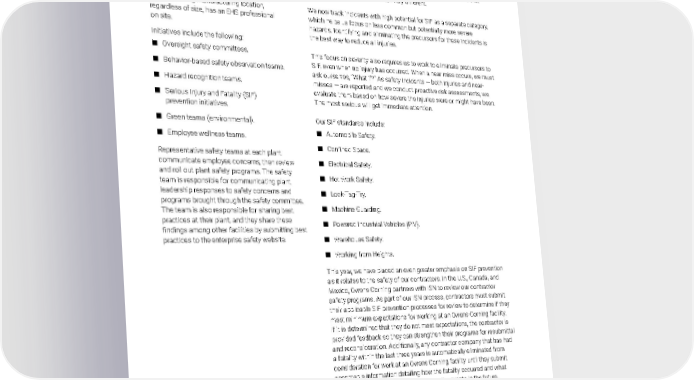 2021 Owens Corning Sustainability Report | Expanding Our Social Handprint | Living Safely | 248 Environment, Health, and Safety (EHS) Committees Our safety goal can only be met through the active engagement of our employees in promoting safety and identifying and reducing the risk of injury. Because tasks vary at different plants, facilities have established a variety of EHS initiatives, and all employees and management are encouraged to take part in them. Every Owens Corning manufacturing location, regardless of size, has an EHS professional on site. Initiatives include the following: ■ Oversight safety committees. ■ Behavior-based safety observation teams. ■ Hazard recognition teams. ■ Serious Injury and Fatality (SIF) prevention initiatives. ■ Green teams (environmental). ■ Employee wellness teams. Representative safety teams at each plant communicate employee concerns, then review and roll out plant safety programs. The safety team is responsible for communicating plant leadership responses to safety concerns and programs brought through the safety committee. The team is also responsible for sharing best practices at their plant, and they share these findings among other facilities by submitting best practices to the enterprise safety website. Preventing Serious Injuries & Fatalities (SIF) Like many other companies around the world, Owens Corning is thinking differently about the best ways to prevent serious injuries and fatalities (SIF). In the past, it was believed that serious injuries and fatalities were caused by the same issues as more common and minor injuries. Newer studies — and our own experience — demonstrate that the factors that contribute to SIF events are often very different. We now track incidents with high potential for SIF as a separate category, which helps us focus on less common but potentially more severe hazards. Identifying and eliminating the precursors for these incidents is the best way to reduce all injuries. This focus on severity also requires us to work to eliminate precursors to SIF, even when no injury has occurred. When a near miss occurs, we must ask ourselves, “What if?” As safety incidents — both injuries and near- misses — are reported and we conduct proactive risk assessments, we evaluate them based on how severe the injuries were or might have been. The most serious will get immediate attention. Our SIF standards include: ■ Automobile Safety. ■ Confined Space. ■ Electrical Safety. ■ Hot Work Safety. ■ Lock-Tag-Try. ■ Machine Guarding. ■ Powered Industrial Vehicles (PIV). ■ Warehouse Safety. ■ Working from Heights. This year, we have placed an even greater emphasis on SIF prevention as it relates to the safety of our contractors. In the U.S., Canada, and Mexico, Owens Corning partners with ISN to review our contractor safety programs. As part of our ISN process, contractors must submit their applicable SIF prevention processes for review to determine if they meet minimum expectations for working at an Owens Corning facility. If it is determined that they do not meet expectations, the contractor is provided feedback so they can strengthen their programs for resubmittal and reconsideration. Additionally, any contractor company that has had a fatality within the last three years is automatically eliminated from consideration for work at an Owens Corning facility until they submit acceptable information detailing how the fatality occurred and what actions were taken to prevent this or similar events in the future. The concept is now being expanded into Europe, using software that has been developed internally to review SIF programs that are specific to the types of work performed by Owens Corning contractors. This software is being tested at our plant in Besana, Italy, and we intend to roll it out in Europe in the coming months, and in Asia Pacific in 2023.