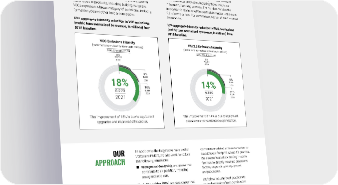 2021 Owens Corning Sustainability Report | Reducing Our Environmental Footprint | Air Quality Management | 160 By 2030, we will reduce the aggregate intensity of our emissions of volatile organic compounds (VOCs) and fine particulate matter (PM2.5) by 50%. OUR APPROACH In addition to the targets we have set for VOCs and PM2.5, we also work to reduce the following emissions: ■ Nitrogen oxides (NOx) , are gases that contribute to air pollution, including smog and acid rain. ■ Sulfur oxides (SOx) are also gases that contribute to air pollution and can harm plant life, contribute to acid rain, and lead to ill health in humans. We manage, track, and report against NOx and SOx air emissions requirements. The ways we measure and control NOx and SOx vary by location and local regulatory requirements. A significant source of these emissions is combustion, and we use combustion-related emissions factors to calculate our footprint where it’s practical. We also perform stack testing in some facilities to directly measure emissions factors, depending on equipment and processes. We follow industry best practices to control emissions from combustion processes. In addition to routinely inspecting boilers and other types of burners and keeping them tuned, we work to ensure optimal fuel mixtures. 2030 GOALS FOR AIR QUALITY MANAGEMENT Volatile organic compounds (VOCs) are certain carbon compounds that evaporate into the air at room temperature and contribute to ground level ozone formation. They are found in manufacturing processes and are used in many types of products, including building materials. VOCs represent a broad category of emissions, including formaldehyde and other toxic air emissions. Fine particulate matter (PM2.5) refers to tiny, inhalable particles that can be released during chemical reactions and mechanical processes, including those that occur in the manufacturing process. The number denotes the aerodynamic diameter of the particulate matter, in this case 2.5 microns or less. For comparison, a grain of sand is about 90 microns. 50% aggregate intensity reduction in VOC emissions (metric tons normalized by revenue, in millions) from 2018 baseline. This improvement of 14% is due to equipment operations and maintenance optimization. 50% aggregate intensity reduction in PM2.5 emissions (metric tons normalized by revenue, in millions) from 2018 baseline. This improvement of 18% is due to equipment upgrades and improved efficiencies. VOC Emissions Intensity (metric tons normalized by revenue, in millions) GOAL: 50% R EDUCTION 18% 0.273 2021 201 8 BASE YEAR 0.331 5% 0.313 2019 10% 0.299 2020 PM 2.5 Emissions Intensity (metric tons normalized by revenue, in millions) GOAL: 50% R EDUCTION 14% 0.280 2021 201 8 BASE YEAR 0.326 6% 0.306 2019 11% 0.290 2020