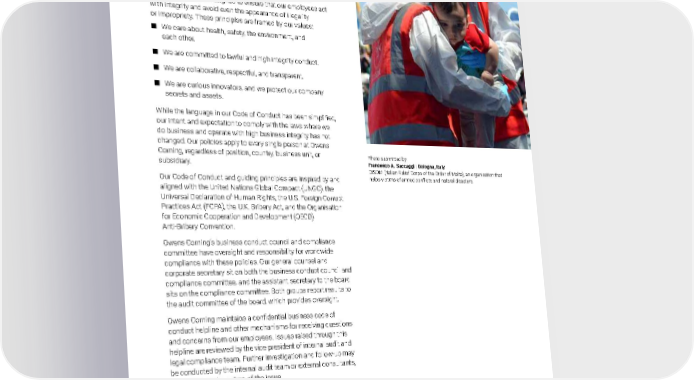 2021 Owens Corning Sustainability Report | Our Approach | Compliance and Beyond | 73 The Owens Corning Code of Conduct Our Code of Conduct serves as an extension of our corporate values and guides our approach to business. The Code of Conduct was modernized and republished in 2022 to align more closely to our updated values and to reflect our culture more accurately as it has evolved through an expanding global presence and workforce. It contains the principles that guide ethical conduct in our business, which are designed to ensure that our employees act with integrity and avoid even the appearance of illegality or impropriety. These principles are framed by our values: ■ We care about health, safety, the environment, and each other. ■ We are committed to lawful and high integrity conduct. ■ We are collaborative, respectful, and transparent. ■ We are curious innovators, and we protect our company secrets and assets. While the language in our Code of Conduct has been simplified, our intent and expectation to comply with the laws where we do business and operate with high business integrity has not changed. Our policies apply to every single person at Owens Corning, regardless of position, country, business unit, or subsidiary. Our Code of Conduct and guiding principles are inspired by and aligned with the United Nations Global Compact (UNGC), the Universal Declaration of Human Rights, the U.S. Foreign Corrupt Practices Act (FCPA), the U.K. Bribery Act, and the Organisation for Economic Cooperation and Development (OECD) Anti-Bribery Convention. Owens Corning’s business conduct council and compliance committee have oversight and responsibility for worldwide compliance with these policies. Our general counsel and corporate secretary sit on both the business conduct council and compliance committee, and the assistant secretary to the board sits on the compliance committee. Both groups report results to the audit committee of the board, which provides oversight. Owens Corning maintains a confidential business code of conduct helpline and other mechanisms for receiving questions and concerns from our employees. Issues raised through this helpline are reviewed by the vice president of internal audit and legal compliance team. Further investigation and follow-up may be conducted by the internal audit team or external consultants, depending on the nature of the issue. Photo submitted by: Francesco A. Saccaggi | Bologna, Italy CISOM (Italian Relief Corps of the Order of Malta), an organization that helps victims of armed conflicts and natural disasters.