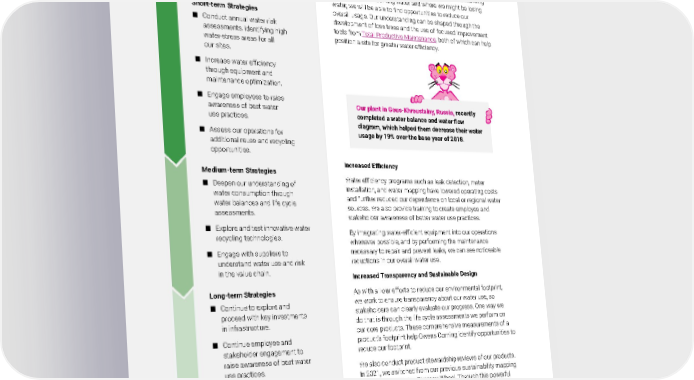 2021 Owens Corning Sustainability Report | Reducing Our Environmental Footprint | Responsible Water | 169 To help ensure that we are using and sourcing water wisely, the following strategies will drive our progress: Water Balance This refers to a site’s mass balance specific to water — looking at the amount of water going into the process, the amount of water going out, and what we do with it in between. By understanding where we are consuming water and where we might be losing water, we will be able to find opportunities to reduce our overall usage. Our understanding can be shaped through the development of loss trees and the use of focused improvement tools from Total Productive Maintenance, both of which can help position a site for greater water efficiency. Increased Efficiency Water efficiency programs such as leak detection, meter installation, and water mapping have lowered operating costs and further reduced our dependence on local or regional water sources. We also provide training to create employee and stakeholder awareness of better water use practices. By integrating water-efficient equipment into our operations whenever possible, and by performing the maintenance necessary to repair and prevent leaks, we can see noticeable reductions in our overall water use. Increased Transparency and Sustainable Design As with all our efforts to reduce our environmental footprint, we work to ensure transparency about our water use, so stakeholders can clearly evaluate our progress. One way we do that is through the life cycle assessments we perform on our core products. These comprehensive measurements of a product’s footprint help Owens Corning identify opportunities to reduce our footprint. We also conduct product stewardship reviews of our products. In 2021, we switched from our previous sustainability mapping tool to the Ecodesign Strategy Wheel. Through this powerful brainstorming tool, product designers can determine ways of ensuring product sustainability — including minimizing water use — throughout a product’s entire life cycle beginning at the initial design phase. More information about the Ecodesign Strategy Wheel can be found in the Product Innovation & Stewardship chapter in this report. Our plant in Gous-Khroustalny, Russia, recently completed a water balance and water flow diagram, which helped them decrease their water usage by 19% over the base year of 2018 . Our Water Roadmap Owens Corning’s plan to reduce water withdrawal intensity in high water-stress sites and remain flat or reduce water withdrawal intensity at all remaining sites includes the following strategies: Short-term Strategies ■ Conduct annual water risk assessments, identifying high water-stress areas for all our sites. ■ Increase water efficiency through equipment and maintenance optimization. ■ Engage employees to raise awareness of best water use practices. ■ Assess our operations for additional reuse and recycling opportunities. Medium-term Strategies ■ Deepen our understanding of water consumption through water balances and life cycle assessments. ■ Explore and test innovative water recycling technologies. ■ Engage with suppliers to understand water use and risk in the value chain. Long-term Strategies ■ Continue to explore and proceed with key investments in infrastructure. ■ Continue employee and stakeholder engagement to raise awareness of best water use practices.