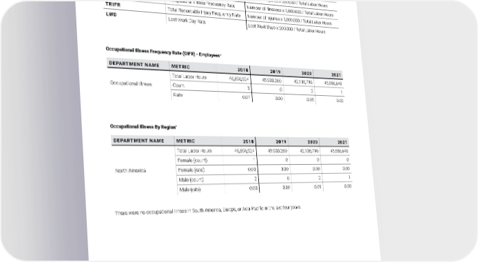 Occupational Illness Frequency Rate (OIFR) - Employees + DEPARTMENT NAME METRIC 2018 2019 2020 2021 Occupational Illness Total Labor Hours 45,596,924 45,900,250 42,105,796 45,586,648 Count 3 0 2 1 Rate 0.07 0.00 0.05 0.02 Occupational Illness By Region + DEPARTMENT NAME METRIC 2018 2019 2020 2021 North America Total Labor Hours 45,596,924 45,900,250 42,105,796 45,586,648 Female (count) 1 0 0 0 Female (rate) 0.00 0.00 0.00 0.00 Male (count) 2 0 2 1 Male (rate) 0.00 0.00 0.01 0.00 There were no occupational illness in South America, Europe, or Asia Pacific in the last four years. WORKFORCE DATA SAFETY DATA Appendix B 2021 Owens Corning Sustainability Report | Appendices | 298 ACRONYM DEFINITION FORMULA LWIR Lost Work Day Injury Rate Lost Work Day Cases x 200,000 / Total Labor Hours LTIFR Lost Time Injuries Frequency Rate Lost Work Day Cases x 1,000,000 / Total Labor Hours RIR Recordable Incident Rate Number of Injuries x 200,000 / Total Labor Hours OIFR Occupational Illness Frequency Rate Number of Illnesses x 1,000,000 / Total Labor Hours TRIFR Total Recordable Injury Frequency Rate Number of Injuries x 1,000,000 / Total Labor Hours LWD Lost Work Day Rate Lost Work Days x 200,000 / Total Labor Hours