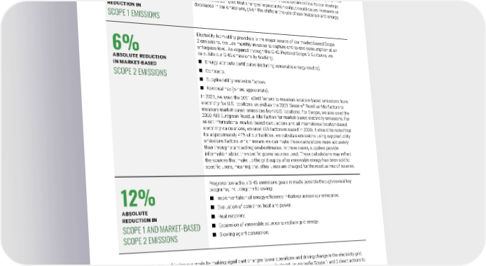 2021 Owens Corning Sustainability Report | Reducing Our Environmental Footprint | Combating Climate Change | 153 CLIMATE CHANGE PERFORMANCE From the base year of 2018 to 2021, Owens Corning’s greenhouse gas emissions progress toward our 2030 goals is as follows: 14% ABSOLUTE REDUCTION IN SCOPE 1 EMISSIONS Most of our Scope 1 emissions are attributable to the blowing agent used in our XPS foam production process, as well as fossil fuel combustion across the company. This is why innovations like our FOAMULAR ® NGX™ insulation are critical to our strategy. It should also be noted that changes in production output could cause increases or decreases in our emissions, given the shifts in the use of raw materials and energy. 6% ABSOLUTE REDUCTION IN MARKET-BASED SCOPE 2 EMISSIONS Electricity from utility providers is the major source of our market-based Scope 2 emissions. We use monthly invoices to capture end-to-end consumption at an enterprise level. As required through the GHG Protocol Scope 2 Guidance, we calculate our GHG emissions by tracking: ■ Energy attribute certificates (including renewable energy credits). ■ Contracts. ■ Supplier/utility emission factors. ■ Residual mix (where appropriate). In 2021, we used the 2021 eGrid factors to measure location-based emissions from electricity for U.S. locations, as well as the 2021 Green-e ® Residual Mix factors to measure market-based emissions from U.S. locations. For Europe, we also used the 2020 AIB European Residual Mix factors for market-based electricity emissions. For select international market-based calculations and all international location-based electricity calculations, we used IEA factors released in 2020. It should be noted that for approximately 47% of our facilities, we calculate emissions using supplier/utility emissions factors, which means we can make these calculations more accurately than through standard regional estimates. In these cases, suppliers provide information about the specific power sources used. These calculations may reflect the sources that make up the grid supply after renewable energy has been sold to specific users, meaning that other users are charged for the residual mix of sources. 12% ABSOLUTE REDUCTION IN SCOPE 1 AND MARKET-BASED SCOPE 2 EMISSIONS Progress toward our GHG emissions goals is made possible through several key programs, including the following: ■ Implementation of energy-efficiency initiatives across our enterprise. ■ Evaluation of combined heat and power. ■ Heat recovery. ■ Expansion of renewable sources to replace grid energy. ■ Blowing agent conversion. We are committed to achieving our goals by making significant changes to our operations and driving change in the electricity grid. We do not purchase carbon offsets as a strategy to reduce our manufacturing footprint, as we prefer Scope 1 and 2 direct actions to accomplish these goals. We do however, on occasion, purchase offsets to achieve customer-inspired embodied carbon reductions beyond what is possible via our direct reductions — for example, to attain carbon neutral-certified products. For PAROC ® Natura insulation, launched in 2020, we select offsets from projects that are within the countries we operate or are within our business strategies. These offsets are not used to reduce our GHG emissions and are not included in our calculations for progress toward our 2030 Sustainability Goals. Per our verified Science-Based Target goal, we are committed to our continued reduction in our GHG emissions globally.