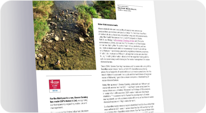 2021 Owens Corning Sustainability Report | Reducing Our Environmental Footprint | Responsible Water | 172 Water Risk Assessments Water-related risks and availability of supply vary across our geographies, processes, and product lines. To minimize the effect of water risk at our locations, we perform regular risk assessments using the World Resources Institute (WRI) Aqueduct Water Risk Atlas. Using the Ecodesign Strategy Wheel and life cycle assessments (LCAs), we can identify the amount of freshwater consumed during the life cycle of each of our products, and we routinely evaluate each site’s environmental footprint, as well as any changes in processes, products, regulatory statuses, or prices. In addition, the results of the annual supplier survey are provided to us, including information about whether suppliers have goals to reduce water usage and strategies for water management in water- stressed areas. Since 2018, Owens Corning has measured its water risk using WRI’s baseline water stress metric, which WRI describes as a strong proxy for all aspects of water risk to a business’s operations. As this metric takes into account the supply and demand stress of regional water withdrawal, it provides a more complete understanding of water-stressed areas. Using this approach, Owens Corning undertook our 10th annual water risk assessment in 2021 — our fourth year using baseline water stress as our metric. We used the findings of this analysis in conjunction with our sites’ 2021 water intake and discharge statistics. This assessment informs the development of water management plans to optimize water efficiency at facilities in water- stressed regions with high water demand. Our baseline water stress analysis identified that 30 of our sites that were active in 2021 were in areas classified by WRI as having high or extremely high baseline water stress. Our facilities at these sites accounted for 23% of our overall water withdrawal in 2021 as well as 26% of our overall water discharge in 2021. Read more about our water risk assessments, including an updated supply chain risk assessment, in our CDP Water Security 2022 Report, which will be published later this year on the sustainability website . Photo submitted by: Cheryl Smith | Newark, Ohio, U.S. Wildlife in Newark, Ohio. For the third year in a row, Owens Corning has made CDP’s Water A List, recognizing our transparency regarding water use and management. This program facilitates informed decision- making to achieve water resilience, better governance of water issues, incentivizing long-term water management planning, and the development of standard water metrics and performance benchmarks for better water quality and quantity. A LIST 2021 WA TER