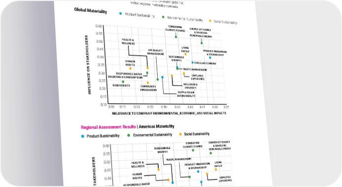 2021 Owens Corning Sustainability Report | Our Approach | Stakeholder Engagement & Material Issues | 39 OWENS CORNING’S MATERIALITY GRIDS Our Materiality Matrices are structured to adhere to GRI standards. In contrast with traditional matrices, this type of matrix reflects the significance of environmental, social, and governance (ESG) impacts to the company, as well as the influence a Material Topic has on stakeholders in their assessments and decision-making. In addition, we have developed grids that reflect regional materiality concerns. The completed matrices reflect the following regions: ■ Americas ■ Asia Pacific ■ Europe Global Materiality Regional Assessment Results | Americas Materiality 0 .10 0 .10 0 .15 0.20 0.25 0.30 0.35 0.40 0.45 0.50 0.55 0.60 0 .15 0.20 0.25 0.30 0.35 0.40 0.45 0.50 0.55 INFLUENCE ON STAKEHOLDERS HUMAN RIGHTS RESPONSIBLE WATER SOURCING & CONSUMPTION H E A LT H & WELLNESS BIODIVERSITY COMMUNITY ENGAGEMENT AIR QUALITY MANAGEMENT SUSTAINABLE GROWTH WASTE MANAGEMENT SUPPLY CHAIN SUSTAINABILITY EMPLOYEE EXPERIENCE COMBATING CLIMATE CHANGE ENERGY EFFICIENCY & SOURCING RENEWABLE ENERGY LIVING S A F E LY PRODUCT INNOVATION & STEWARDSHIP CIRCULAR ECONOMY INCLUSION & DIVERSITY RELEVANCE TO COMPANY ENVIRONMENTAL, ECONOMIC, AND SOCIAL IMPACTS Product Sustainability Environmental Sustainability Social Sustainability 0 .10 0 .10 0 .15 0.20 0.25 0.30 0.35 0.40 0.45 0.50 0.55 0.60 0 .15 0.20 0.25 0.30 0.35 0.40 0.45 0.50 0.55 INFLUENCE ON STAKEHOLDERS RELEVANCE TO COMPANY ENVIRONMENTAL, ECONOMIC, AND SOCIAL IMPACTS HUMAN RIGHTS RESPONSIBLE WATER SOURCING & CONSUMPTION H E A LT H & WELLNESS BIODIVERSITY COMMUNITY ENGAGEMENT AIR QUALITY MANAGEMENT SUSTAINABLE GROWTH WASTE MANAGEMENT SUPPLY CHAIN SUSTAINABILITY EMPLOYEE EXPERIENCE COMBATING CLIMATE CHANGE ENERGY EFFICIENCY & SOURCING RENEWABLE ENERGY LIVING S A F E LY PRODUCT INNOVATION & STEWARDSHIP CIRCULAR ECONOMY INCLUSION & DIVERSITY