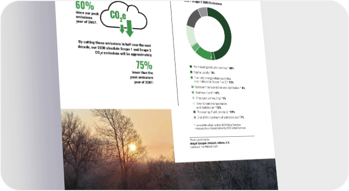 2021 Owens Corning Sustainability Report | Reducing Our Environmental Footprint | Combating Climate Change | 154 Scope 3 Emissions Recognizing the variety of activities both upstream and downstream of our operations, we follow multiple approaches to determine the amount of GHG emissions generated throughout our value chain. In 2021, our Scope 3 emissions totaled 3,345,559 metric tons of CO 2 e. More information about emissions across our value chain can be found on page 315 in Appendix C. We have reduced absolute Scope 1 and Scope 2 CO 2 e emissions by approximately By cutting those emissions in half over the next decade, our 2030 absolute Scope 1 and Scope 2 CO 2 e emissions will be approximately since our peak emissions year of 2007. 60% 75% lower than the peak emissions year of 2007. 2021 Scope 3 GHG Emissions Purchased goods and services ^ 48% Capital goods + 3% Fuel- and energy-related activities (not included in Scope 1 or 2) ^ 12% Upstream transportation and distribution ^ 4% Business travel ^ <1% Employee commuting ^ 1% Downstream transportation and distribution ^ 12% Processing of sold products + 14% End of life treatment of sold products ^ 7% ^ Assured to a high level by SCS Global Services + Assured to a moderate level by SCS Global Services Photo submitted by: Abigail Sprague | Wabash, Indiana, U.S. Sunrise at the Wabash plant.