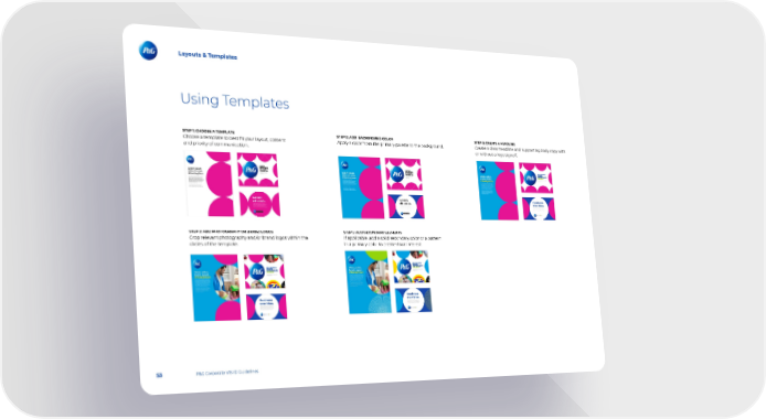 Layouts & Templates Using Templates STEP 1: CHOOSE A TEMPLATE STEP 2: ADD BACKGROUND COLOR STEP 3: CREATE A HEADLINE Choose a template to best 昀椀t your layout, content Apply a color from the primary palette to the background. Create a clear headline and supporting body copy with and priority of communication. or without a logo signoff. STEP 3: ADD PHOTOGRAPHY OR BRAND LOGOS STEP 5: ADD SECONDARY ELEMENTS Crop relevant photography and/or brand logos within the If applicable, add a solid secondary color or a pattern circles of the template. in a primary color to create visual interest. 53 P&G Corporate VIS ID Guidelines