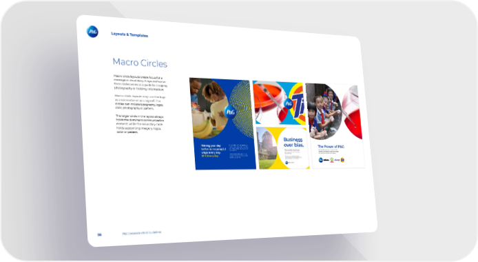 Layouts & Templates Macro Circles Macro circle layouts create focus for a message or visual story. A layout of two or three circles serves as a guide for cropping photography or holding information. Macro circle layouts may use the logo as a connector or as a signoff. The circles can include typography, logos, color, photography or pattern. The larger circle in the layout always holds the dominant communication element, while the secondary circle holds supporting imagery, logos, color or pattern. Business Making your day Int, simodig nient, serum ape vo- over bias. luptio conectem suntem es estiur The Power of P&G better in meaningful sam rectaq uidus aut eos de vide Lici dolorpor ratur ma excerit voloren Int, simodig nient, serum ape voluptio core expellis. itatem re prerrunti voluptur aliquam conectem suntem es estiur sam rectaq ways every day. seque rese quatioratur sumque venis uidus aut eos de vide core expellis Osam alibusdam sum sim nes maio omnihitat. expella boreribus Ibus, venimus #PGEveryday Omni nem evendio. Ut assit isquid peribusdae sit facc. quiam, eosae cusdanimus dignimus est doluptae ratis ius molorro cus di 56 P&G Corporate VIS ID Guidelines