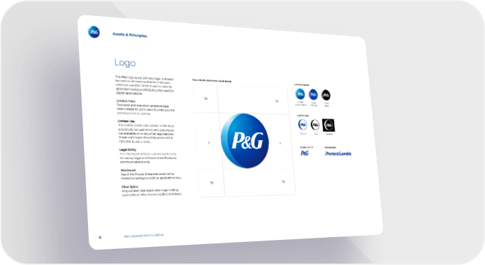 Assets & Principles Logo FULL COLOR LOGO AND CLEAR SPACE LIMITED COLOR The P&G logo is our primary logo. It should be used on all communication in full color whenever possible. CMYK should be used for all printed materials and RGB should be used for digital applications. .5x .5x 2 Color: 1 Color: 1 Color: Limited Color Cyan, Magenta PMS 293 Black Two color and one color variations have been created for print use only when process LIMITED USE printing is not an option. Limited Use The outline single color version of the logo should only be used when print stations are PMS 293 Black Reversed not available or in very small applications. Single color logos should be produced in PMS 293, black or white. x x LEGAL ENTITY WORDMARK Legal Entity The P&G legal entity is reserved exclusively for use by Legal and Governance Relations communications only. Wordmark Use of the Procter & Gamble wordmark is limited to heritage or archival applications only. Clear Space .5x .5x Only consider clear space when logo is being used without other brands, taglines or lockups. 8 P&G Corporate VIS ID Guidelines