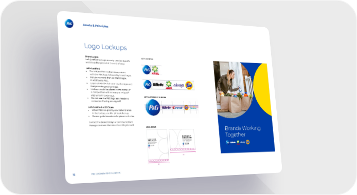 Assets & Principles Logo Lockups Brand Logos LEFT-JUSTIFIED Left-justi昀椀ed lockups are only used as signoffs and should be placed at the end of copy. Left-Justi昀椀ed • The left-justi昀椀ed lockup always starts with the P&G logo followed by brand logos. • Include no more than six brand logos, in addition to P&G. • Logos should be full color on a background that provides good contrast. • Lockup should be placed in the corner of a composition with no copy or a signoff aligned with body copy. • Do not use the P&G logo as a header or LEFT-JUSTIFIED AT 2X SCALE connector if using as a signoff. Left-Justi昀椀ed at 2X Scale • When P&G is a priority over other brands in the lockup, use the 2X Scale lockup. • Review guidelines above for placement rules. Contact the Brand Design or Communications Manager to ensure the correct brand logo is used. LOGO SIZING Brands Working Lorem ipsum Together Lorem ipsum dolor sit amet. Pora dit, consecto in non ni sae nati- dolor sit amet. untiore sum con pa vollorem dersper- Pora dit, consecto in non ni sae nam quam quiam est, is dendios il et - abo. Ut pre essum quostrum. natiuntiore sum con pa vollorem der spernam quam quiam est, is dendios il et abo. Ut pre essum quostrum. BRAND LOGOS BRAND LOGOS X X 15X 12X 12 P&G Corporate VIS ID Guidelines