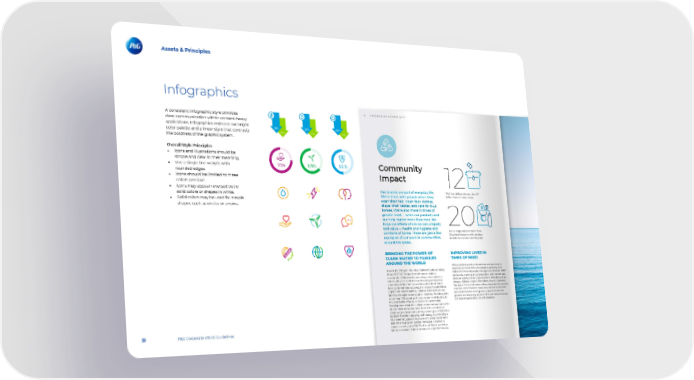 Assets & Principles Infographics A consistent infographic style provides clear communication within content-heavy applications. Infographics embrace our bright 16% 22% 30% color palette and a linear style that contrasts 2525%% 25% 25% the boldness of the graphic system. Overall Style Principles • Icons and illustrations should be simple and clear in their meaning. • Use a single line weight with 75% 63% 50% rounded edges. • Icons should be limited to three colors per icon. • Icons may appear reversed out of solid colors or shapes in white. • Solid colors may be used for simple shapes such as circles or arrows. 31 P&G Corporate VIS ID Guidelines